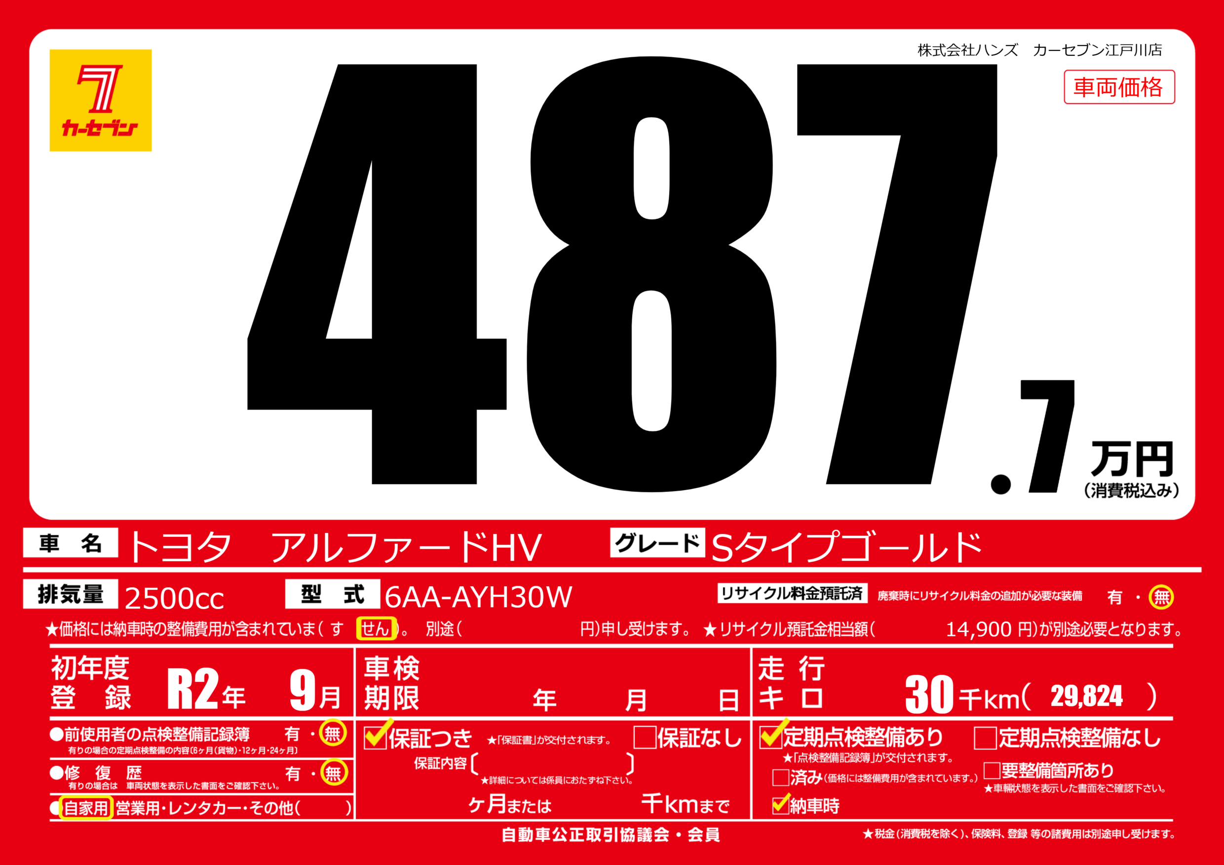 | 車名 | トヨタ アルファードHV | グレード ミッション 排気量 |