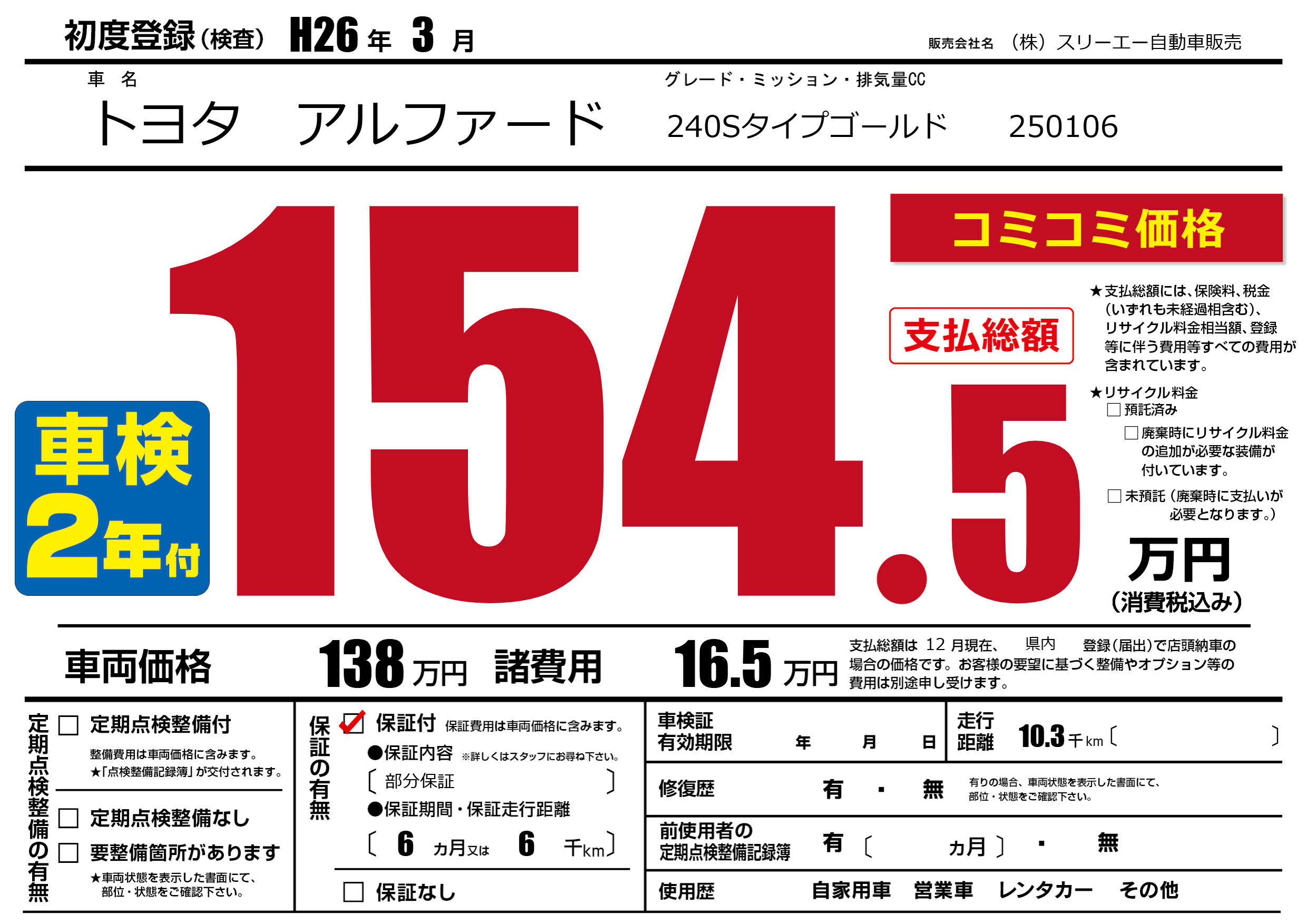 | 車名 | トヨタ アルファード | グレード ミッション 排気量 |