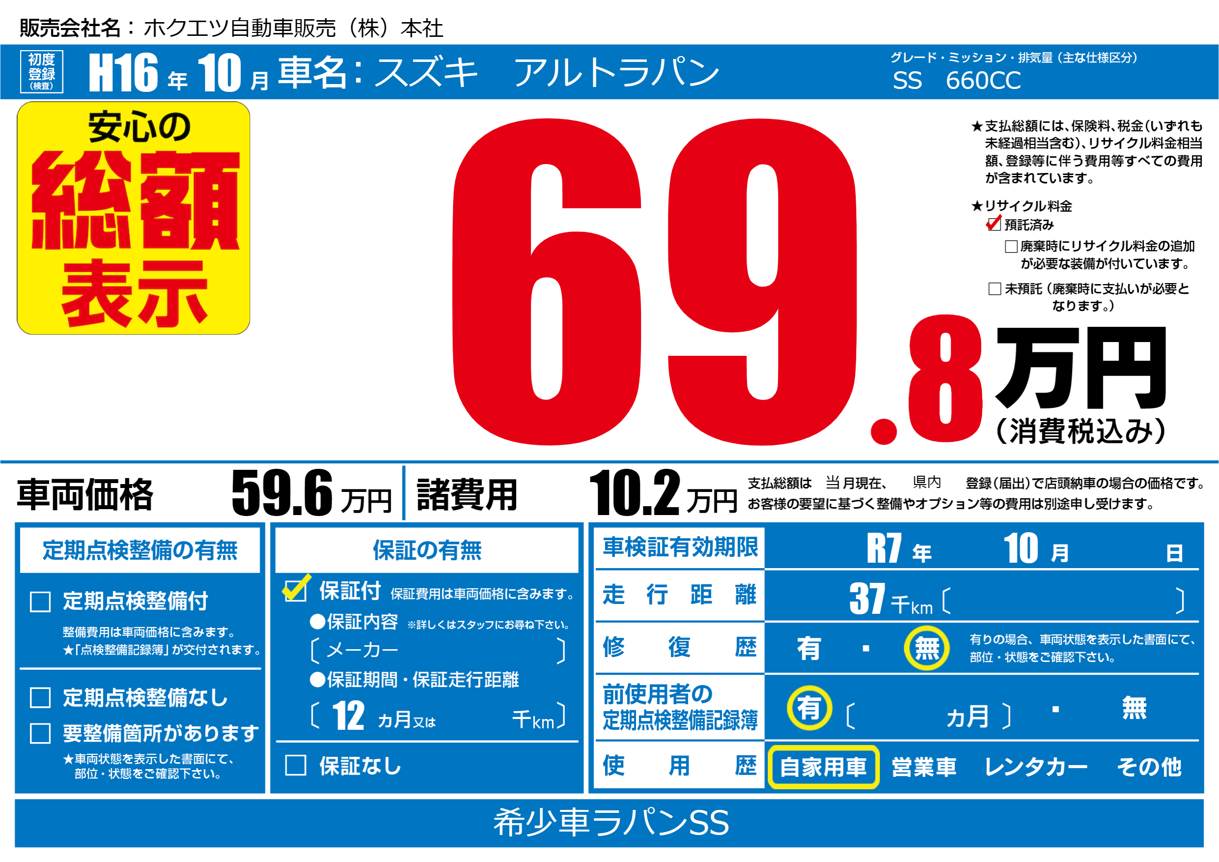 | 走行キロ | 3.7万km | 初年度登録 | H16年10月 |
