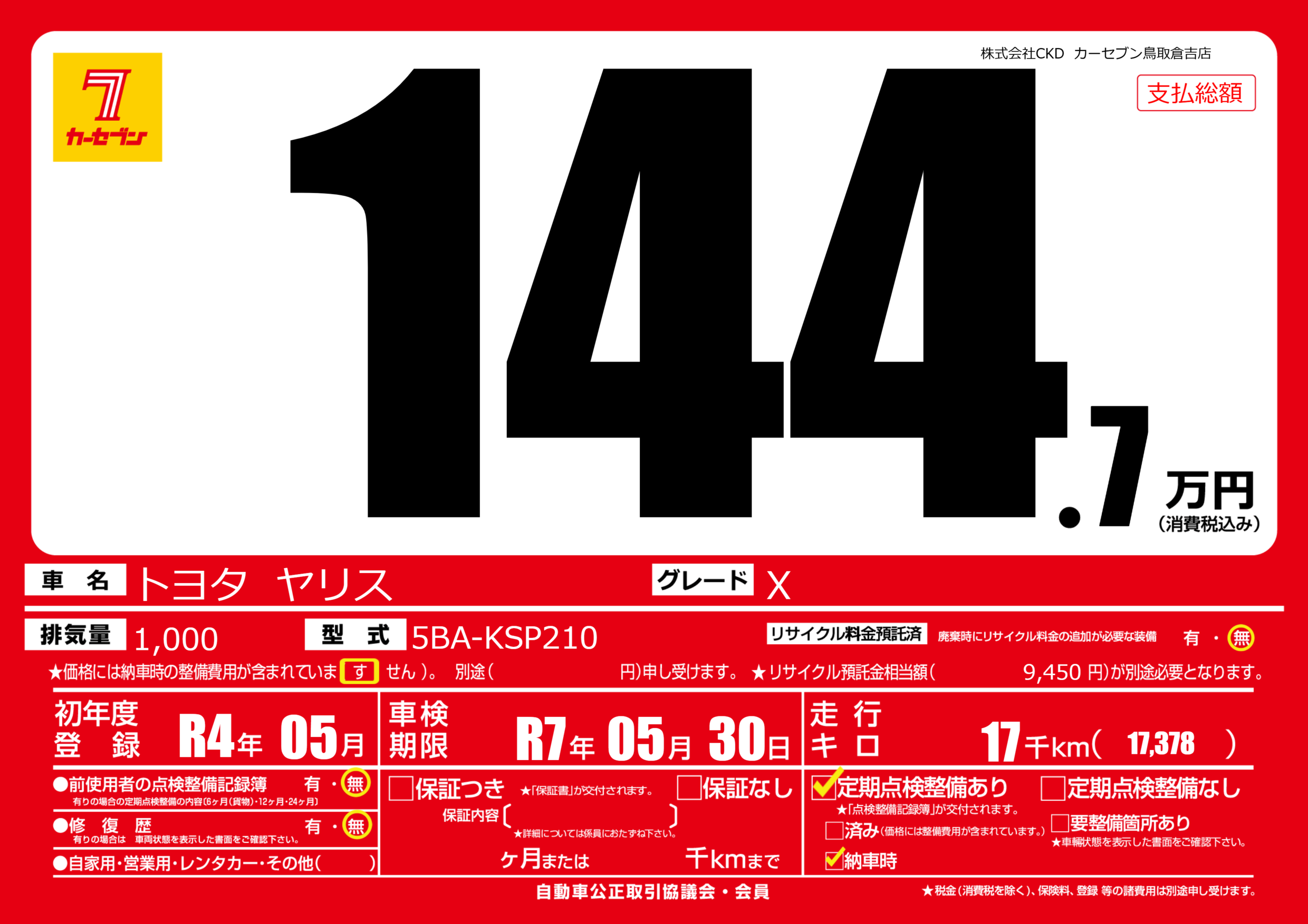 | 車名 | トヨタ ヤリス | グレード ミッション 排気量 |