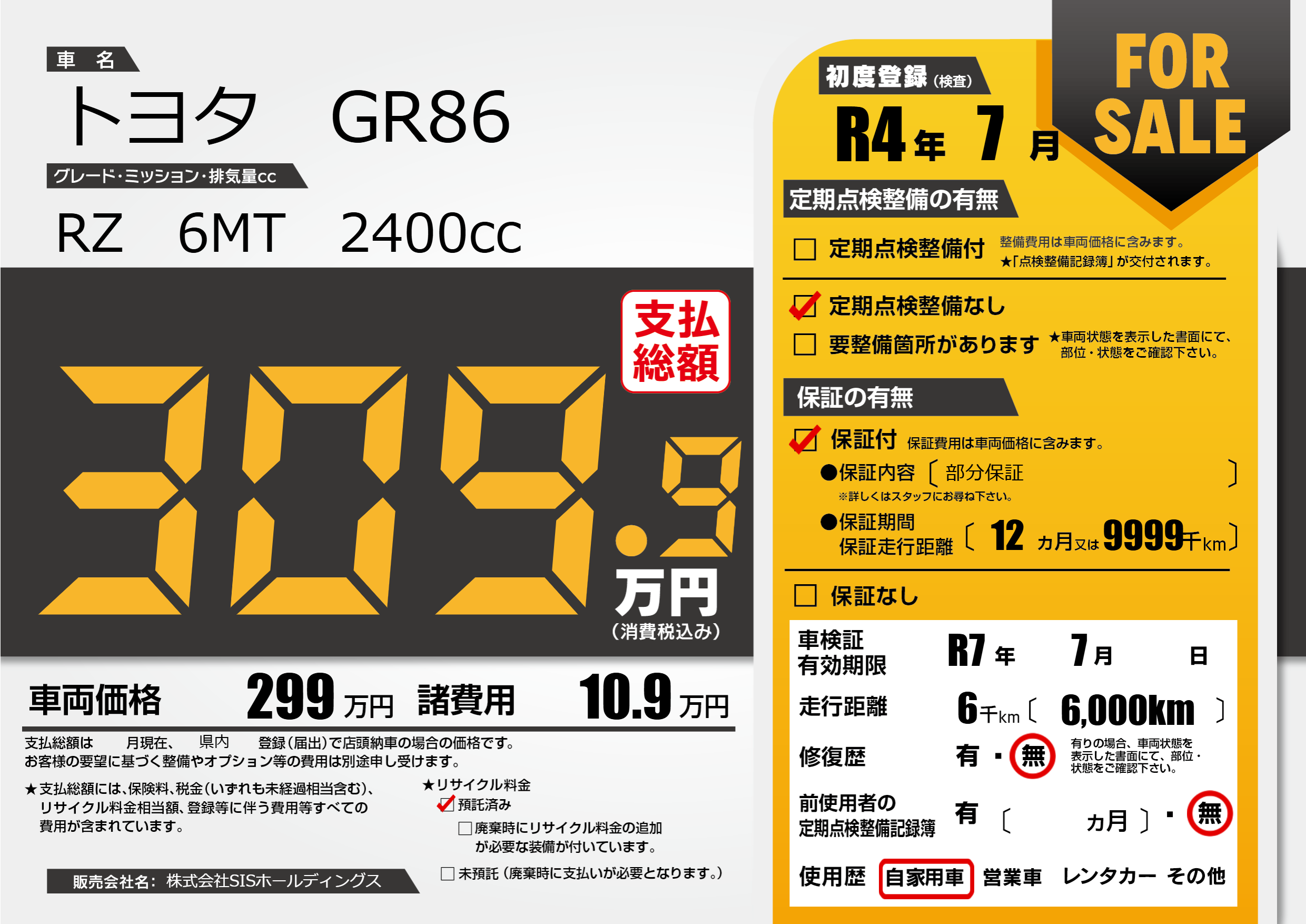| 車名 | トヨタ GR86 | グレード ミッション 排気量 |