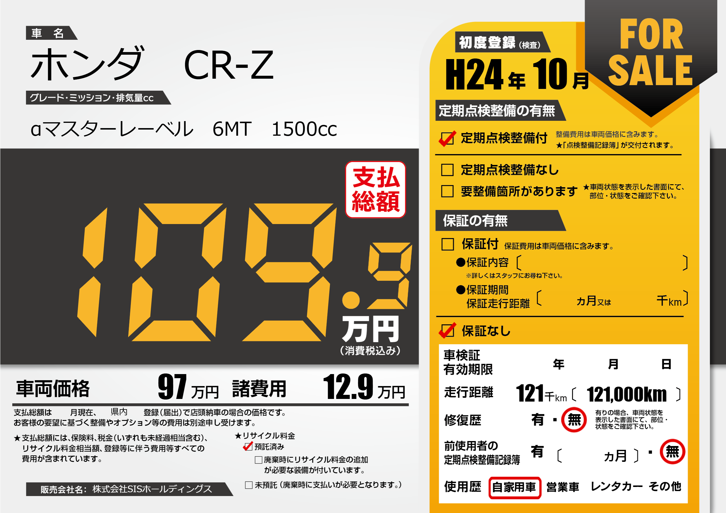 | 車名 | ホンダ CR-Z | グレード ミッション 排気量 |
