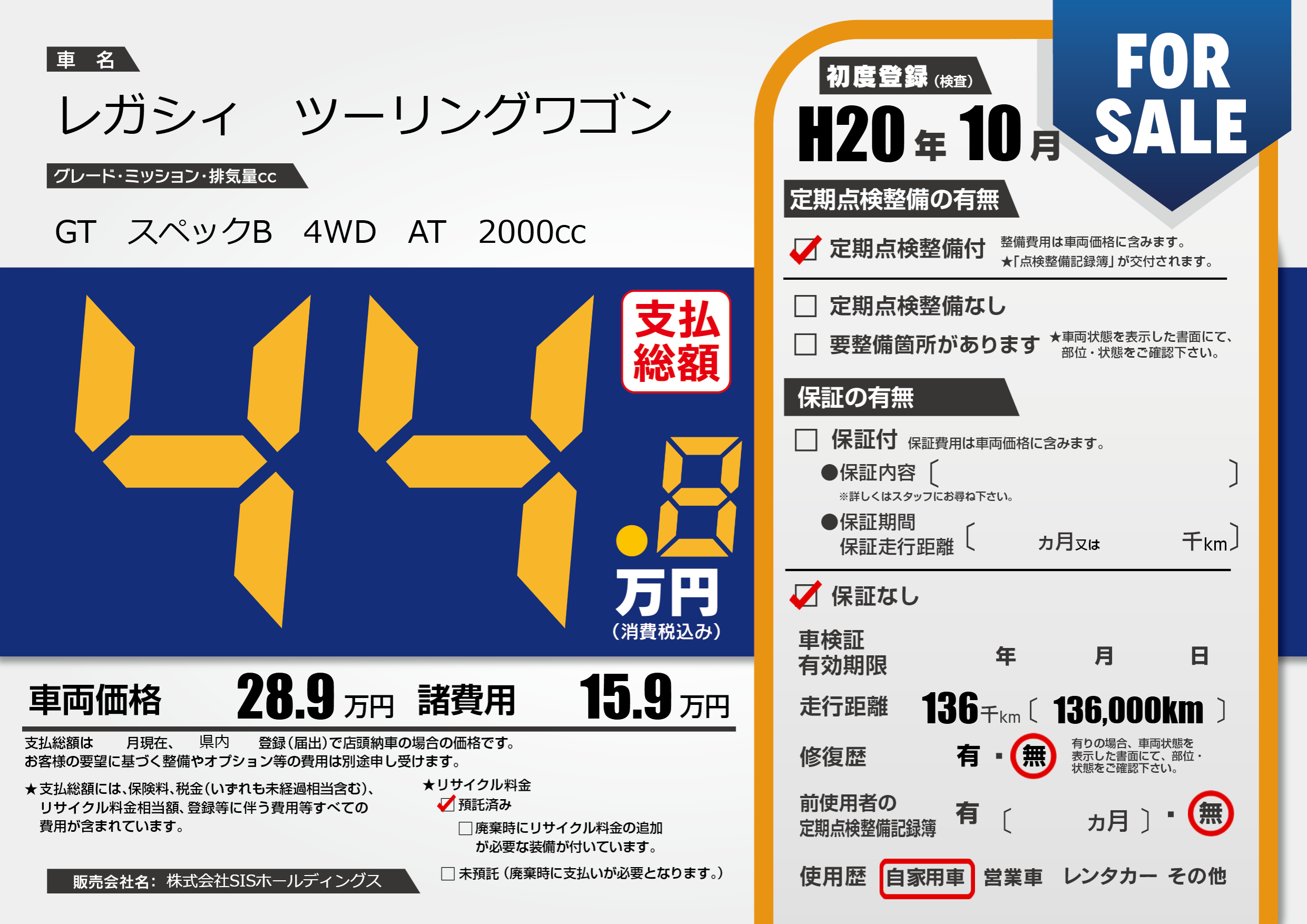 | 車名 | レガシィ ツーリングワゴン | グレード ミッション 排気量 |