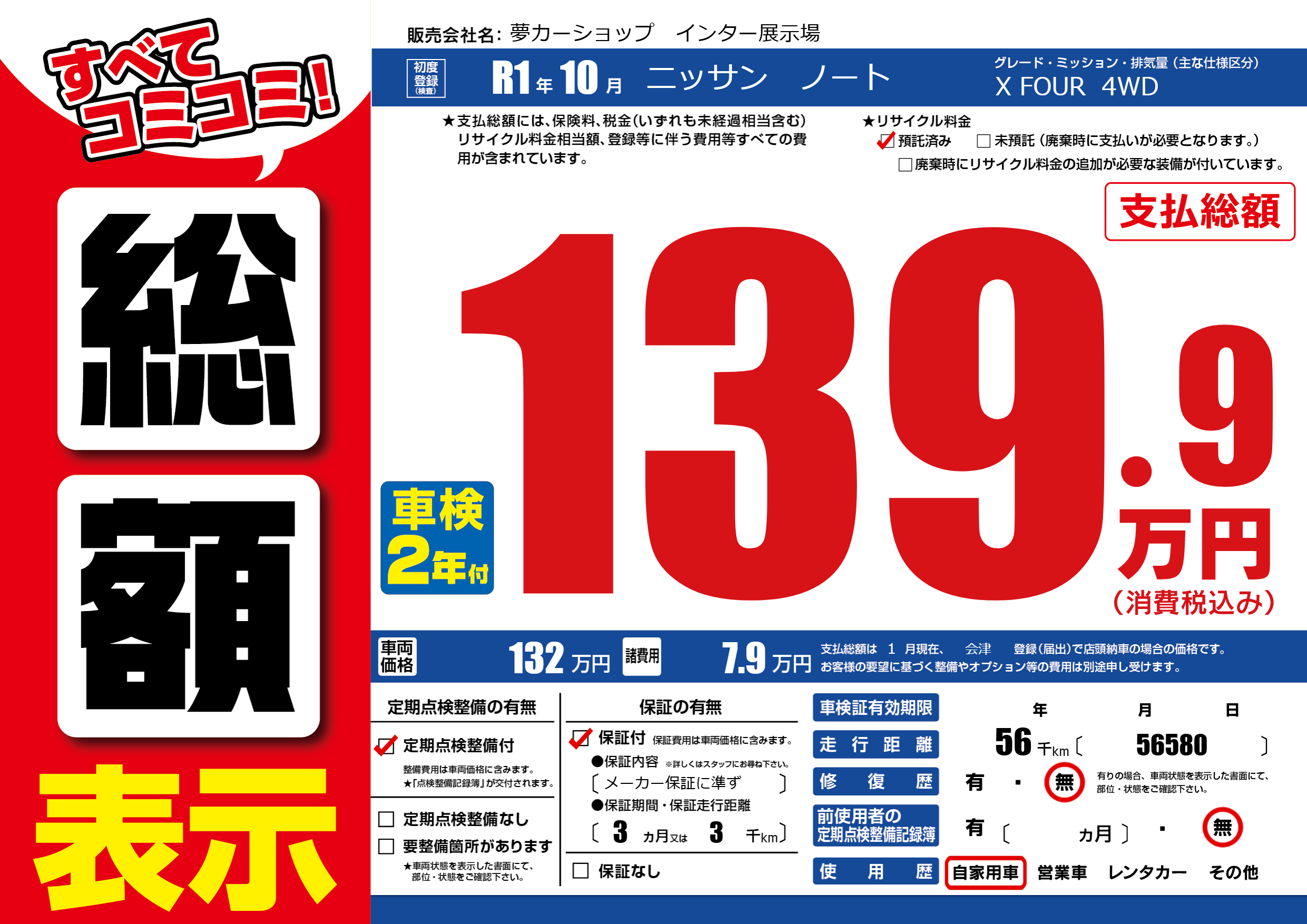 | 車名 | ニッサン ノート | グレード ミッション 排気量 |