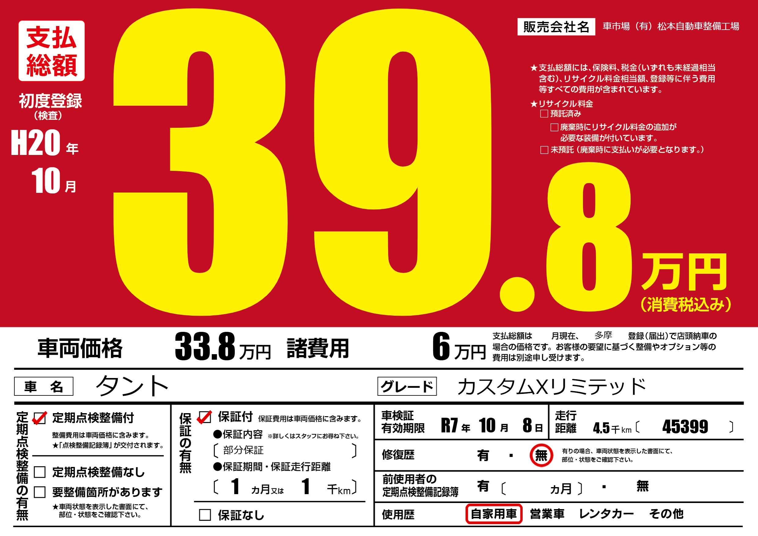 | 走行キロ | 0.4万km | 初年度登録 | H20年10月 |