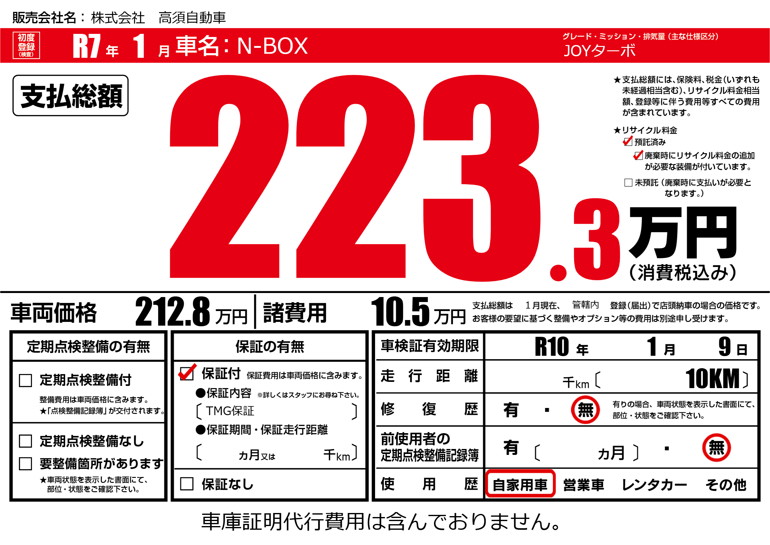 | 車名 | N-BOX | グレード ミッション 排気量 |