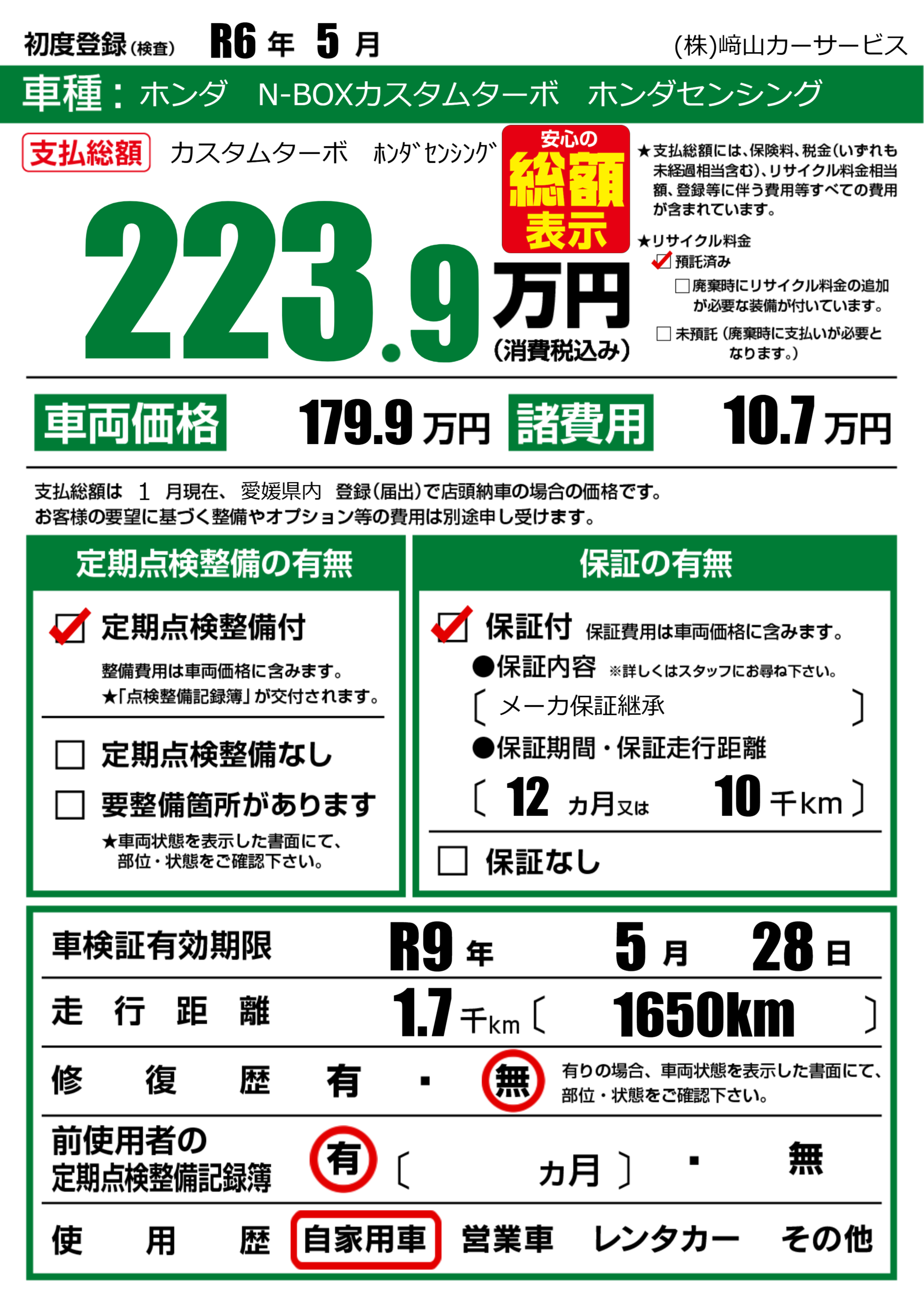 | 走行キロ | 0.1万km | 初年度登録 | R6年5月 |