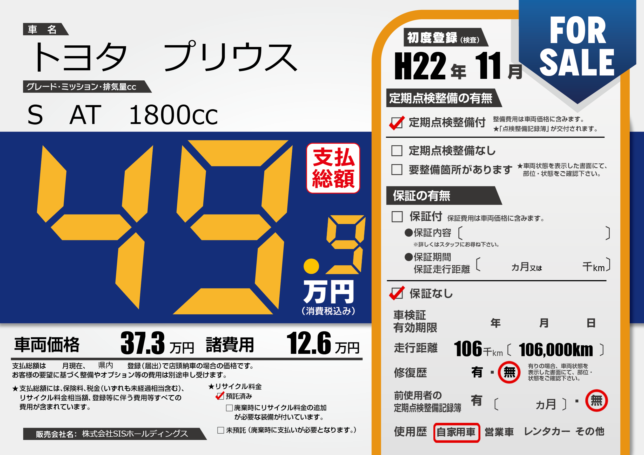 | 車名 | トヨタ プリウス | グレード ミッション 排気量 |