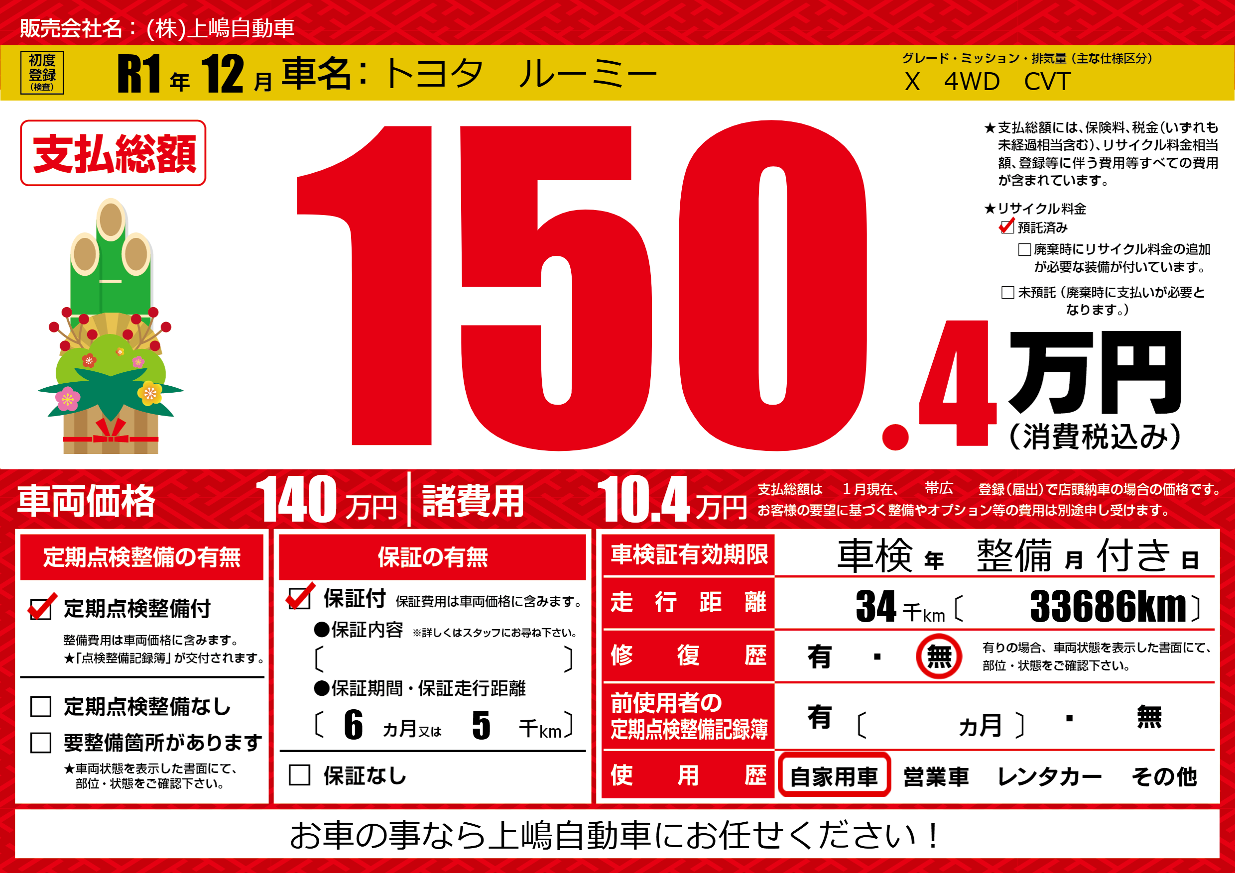 | 車名 | トヨタ ルーミー | グレード ミッション 排気量 |