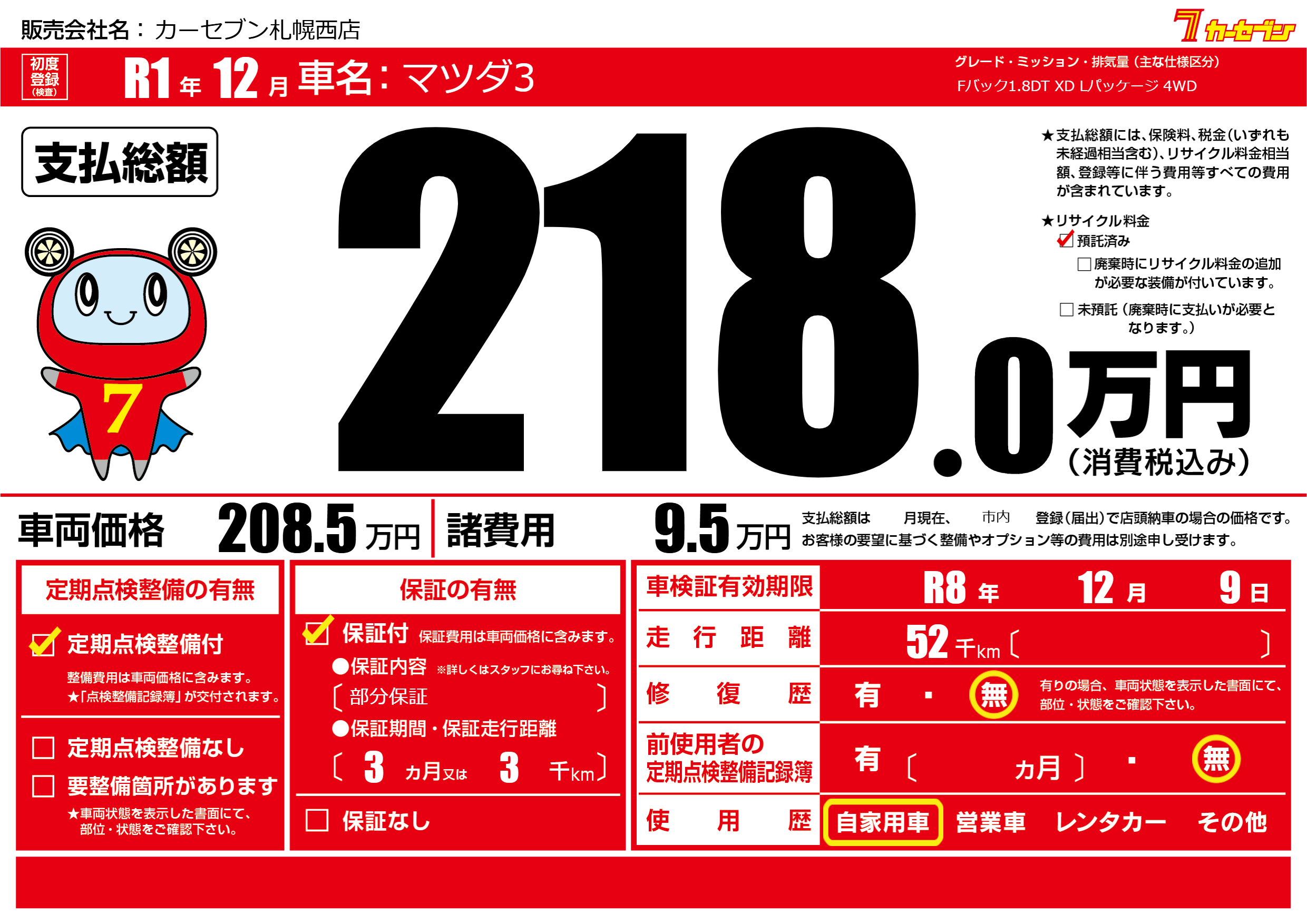 | 車名 | マツダ3 | グレード ミッション 排気量 |