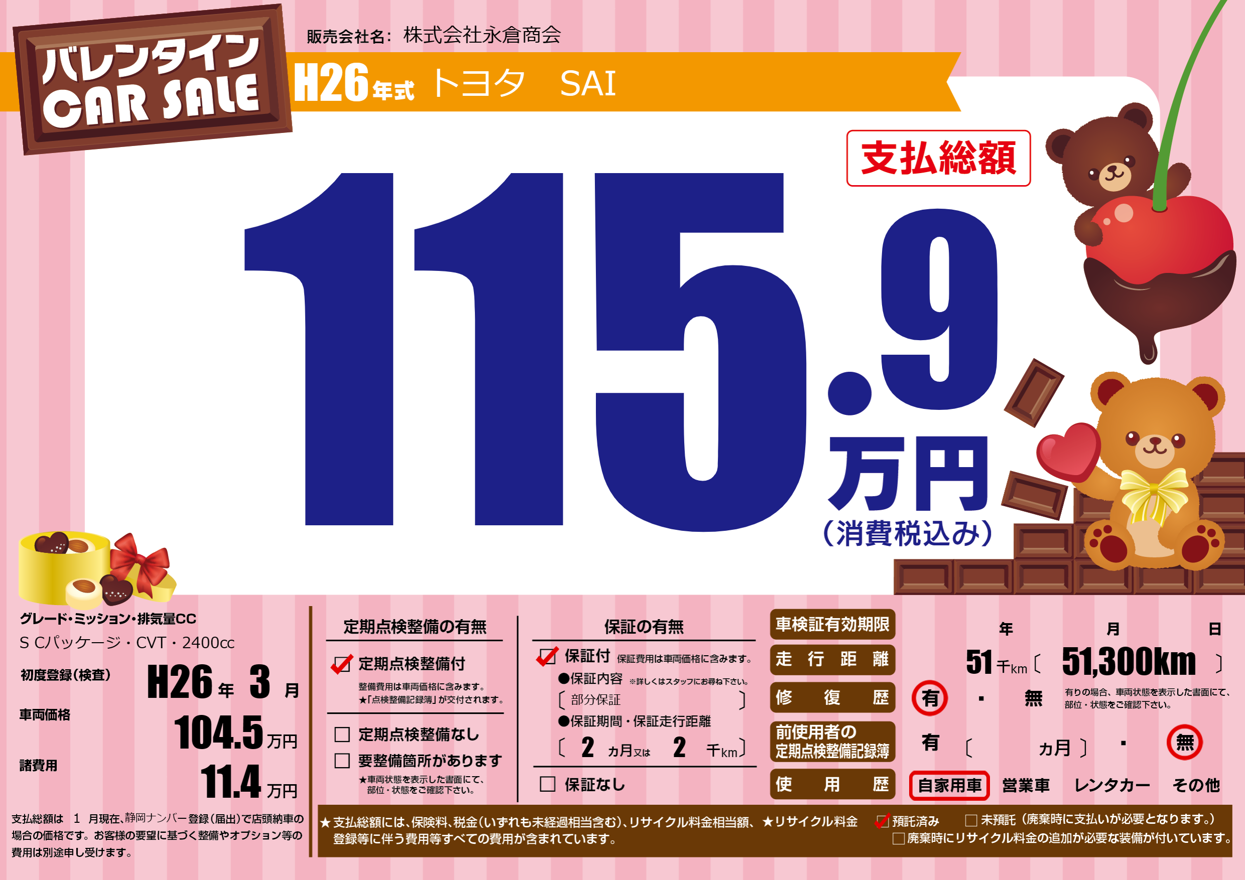 | 車名 | トヨタ SAI | グレード ミッション 排気量 |