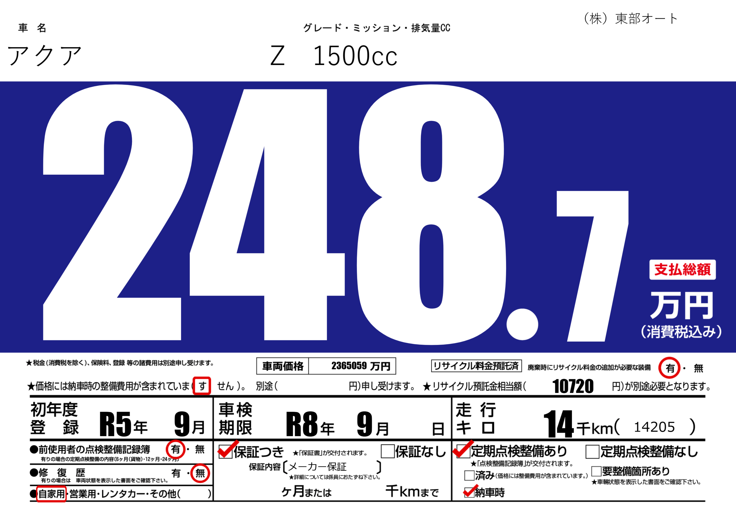 | 走行キロ | 1.4万km | 初年度登録 | R5年9月 |