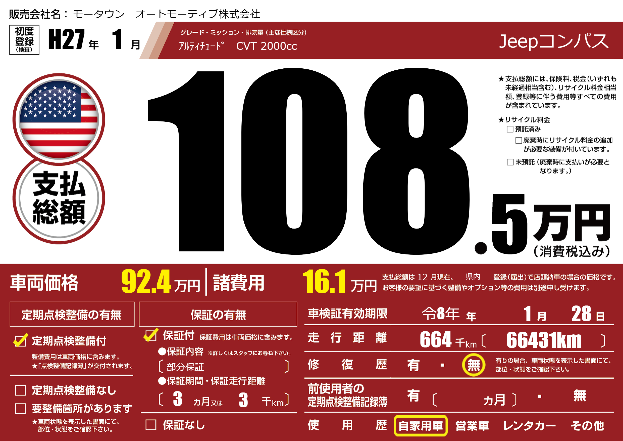 | 車名 | Jeepコンパス | グレード ミッション 排気量 |