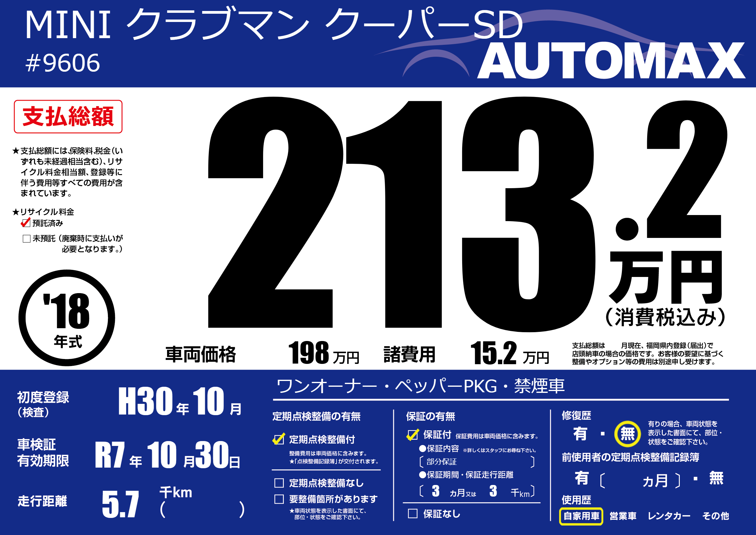 | 車名 | MINI クラブマン クーパーSD | グレード ミッション 排気量 |