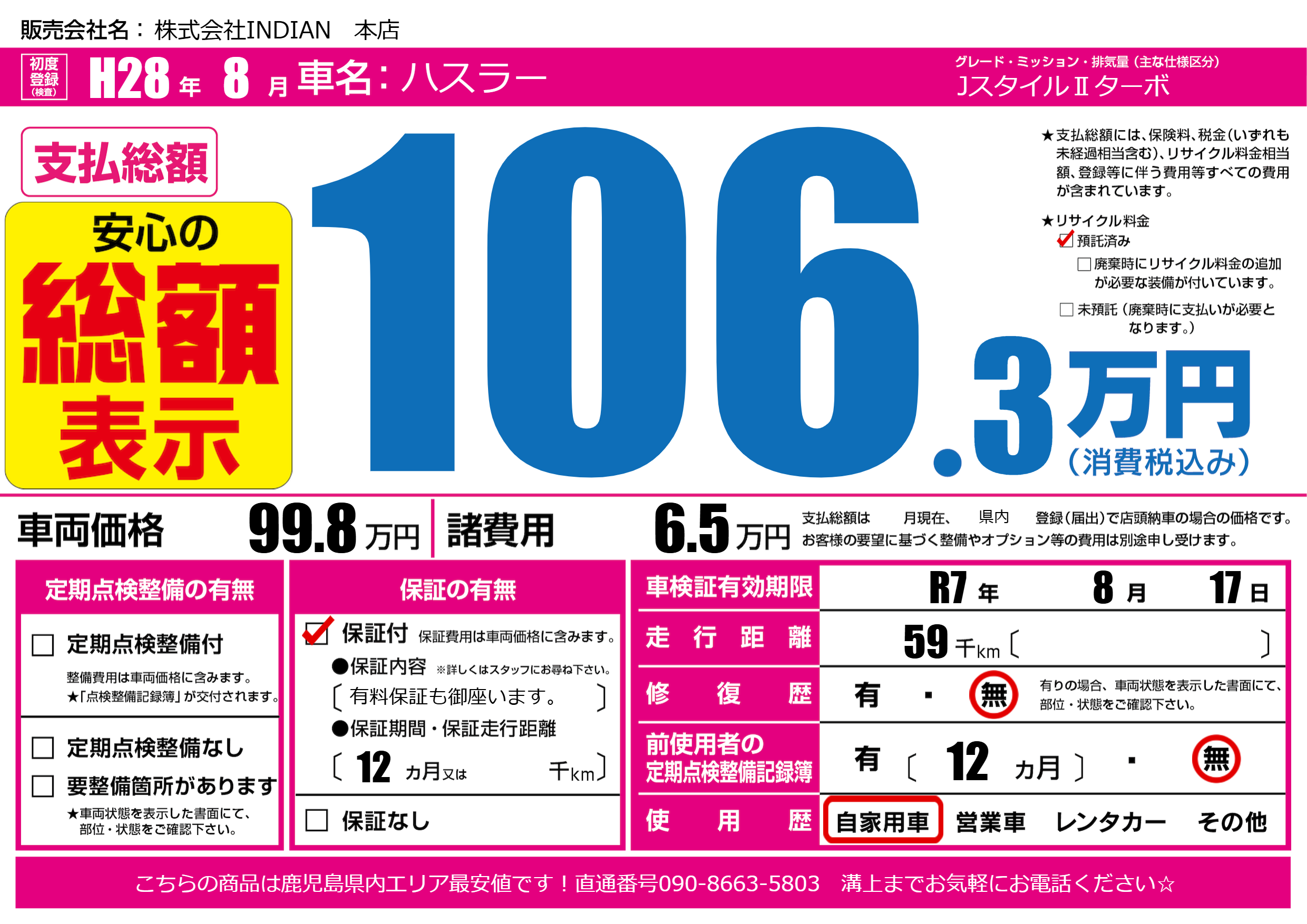 | 車検制限 | R7年 8月 17日 | ||