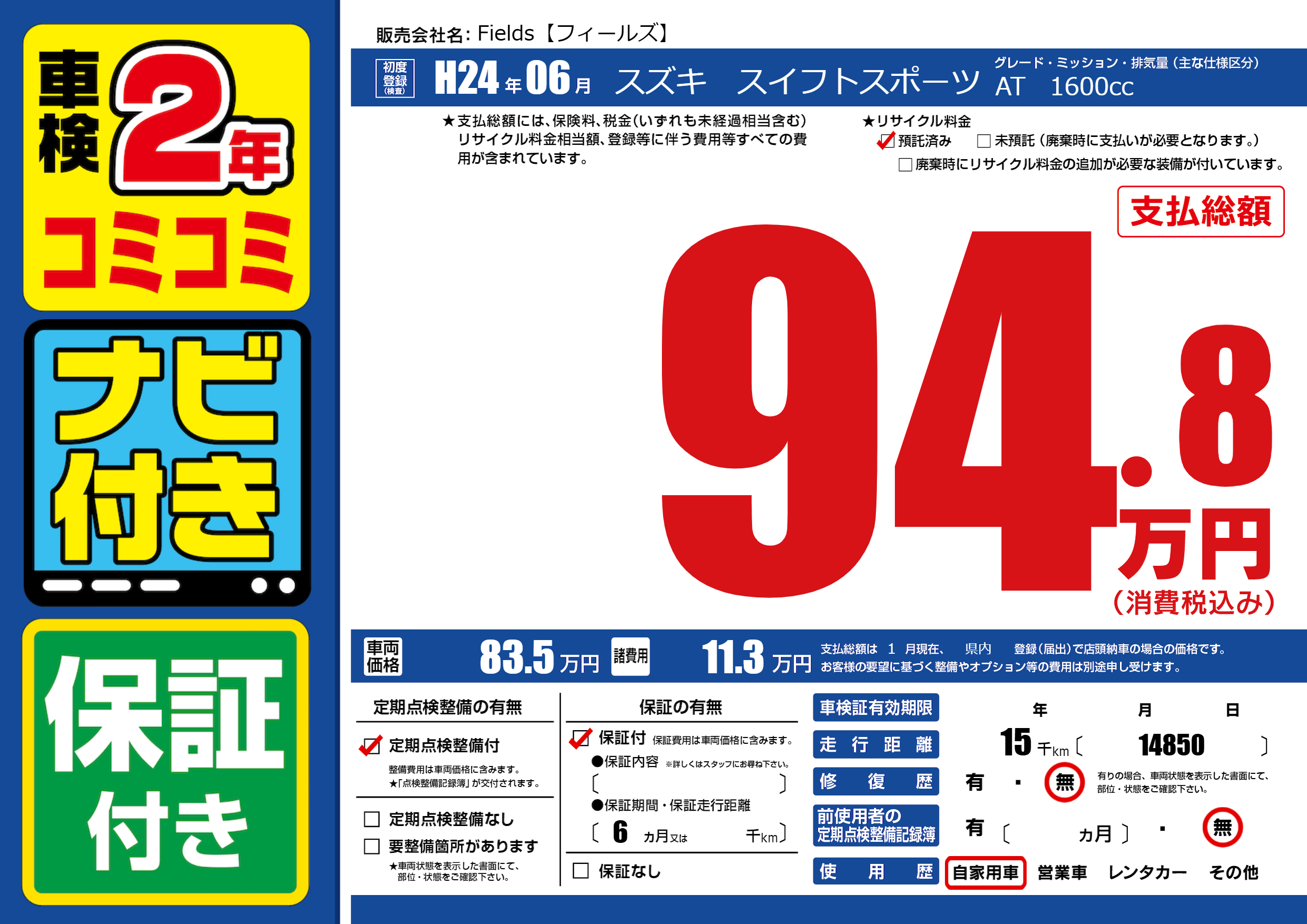 保証付き 保証内容(---) 6ヶ月または()千kmまで |
