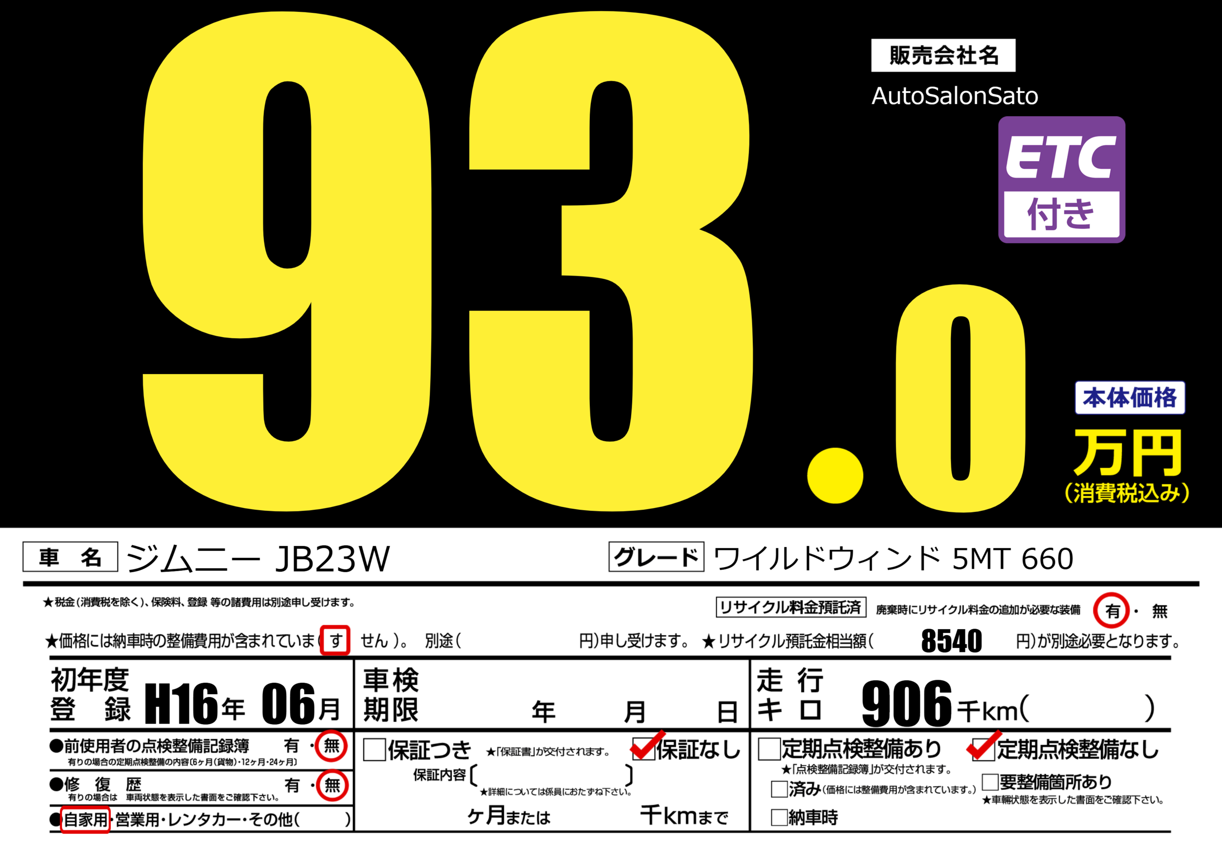 | 車名 | ジムニー JB23W | グレード ミッション 排気量 |