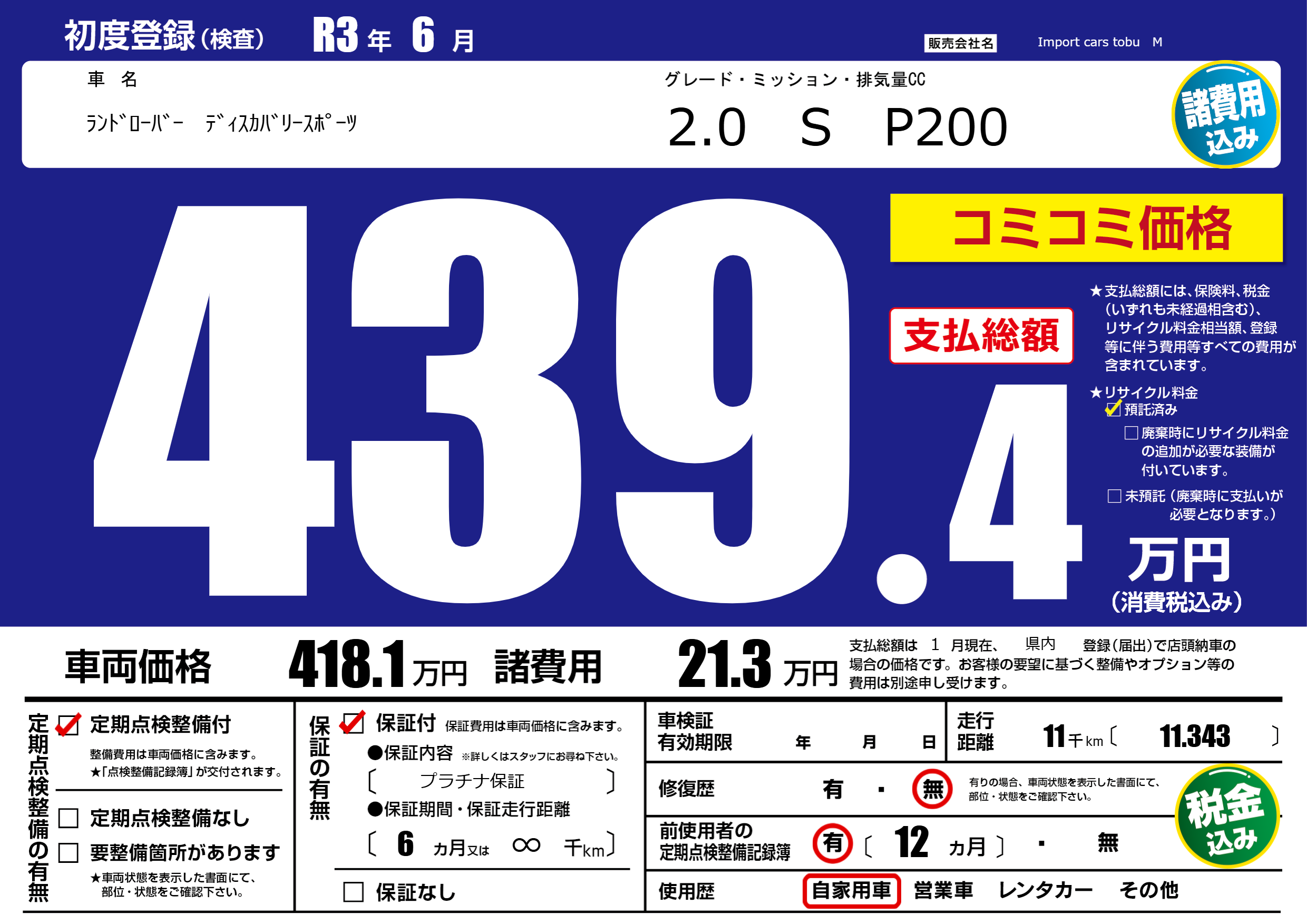 保証付き 保証内容( プラチナ保証) 6ヶ月または(∞)千kmまで |