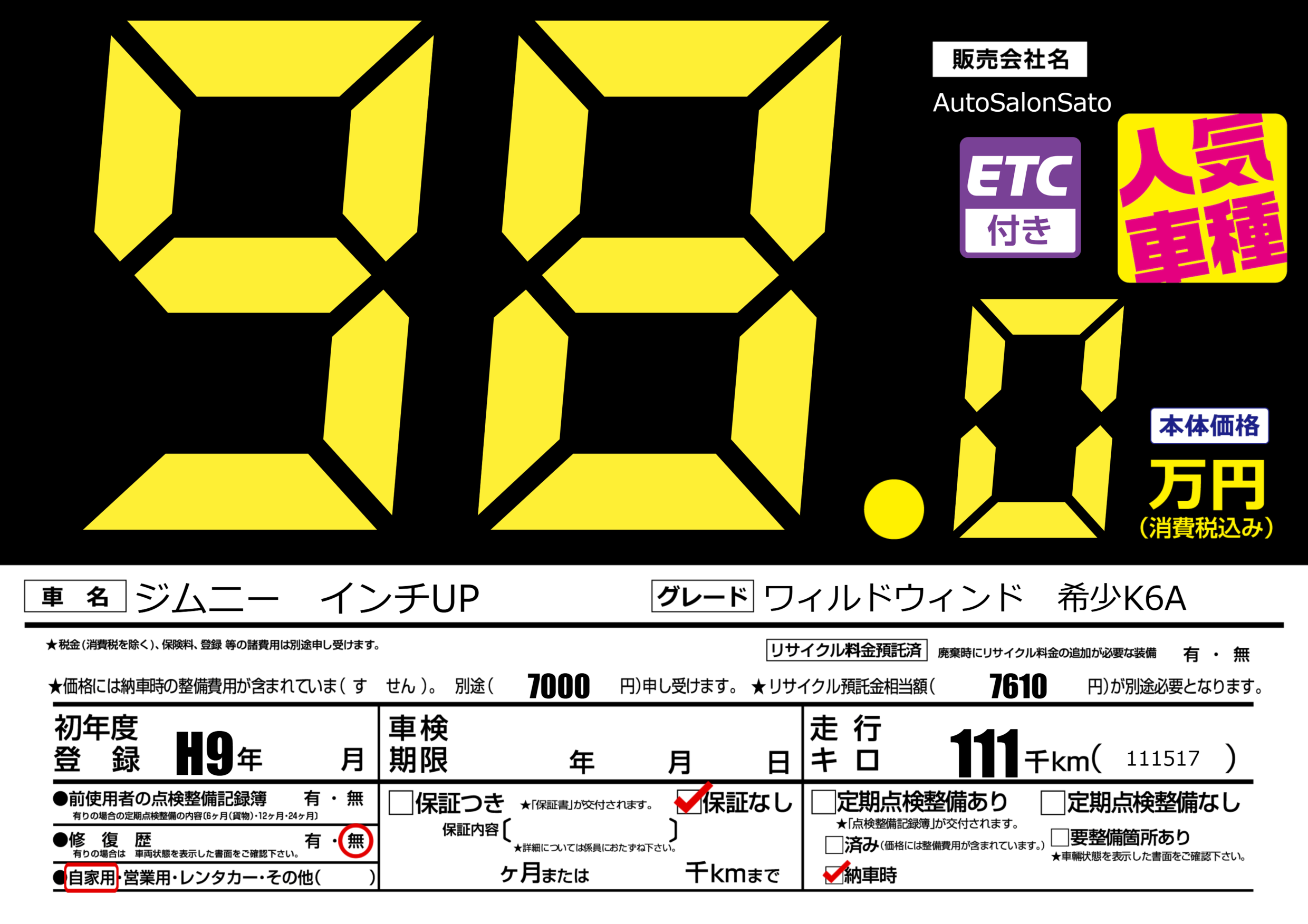 | 車名 | ジムニー インチUP | グレード ミッション 排気量 |