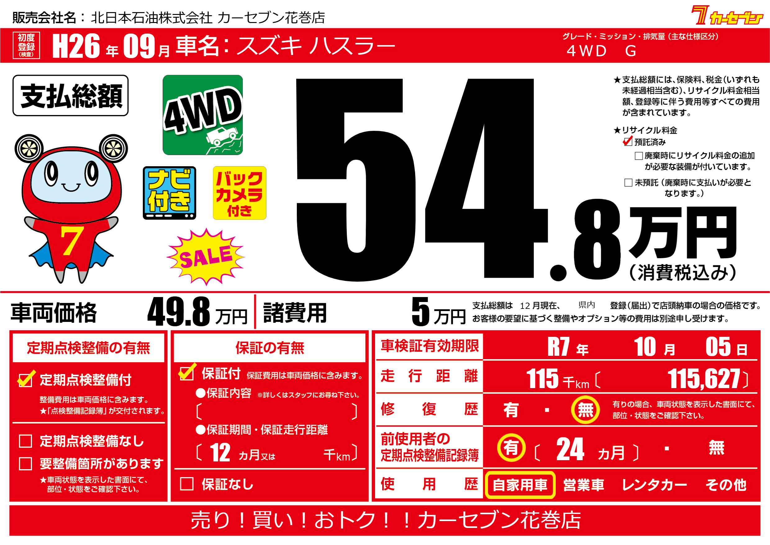 | 走行キロ | 11.5万km | 初年度登録 | H26年09月 |