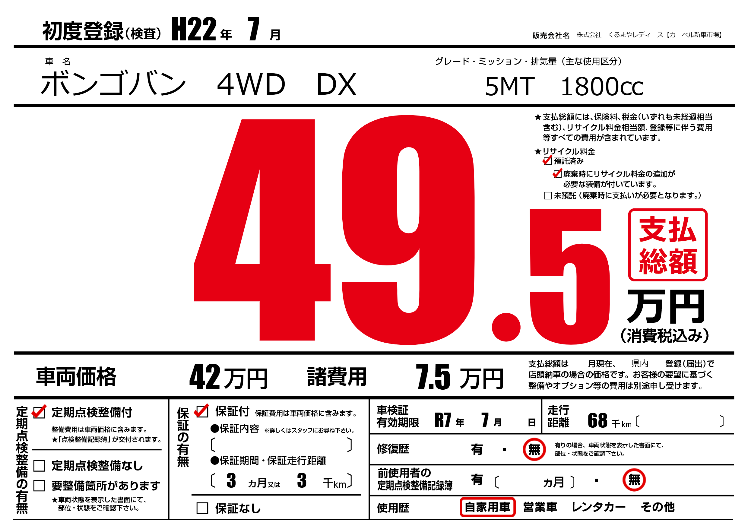 | 車名 | ボンゴバン 4WD DX | グレード ミッション 排気量 |