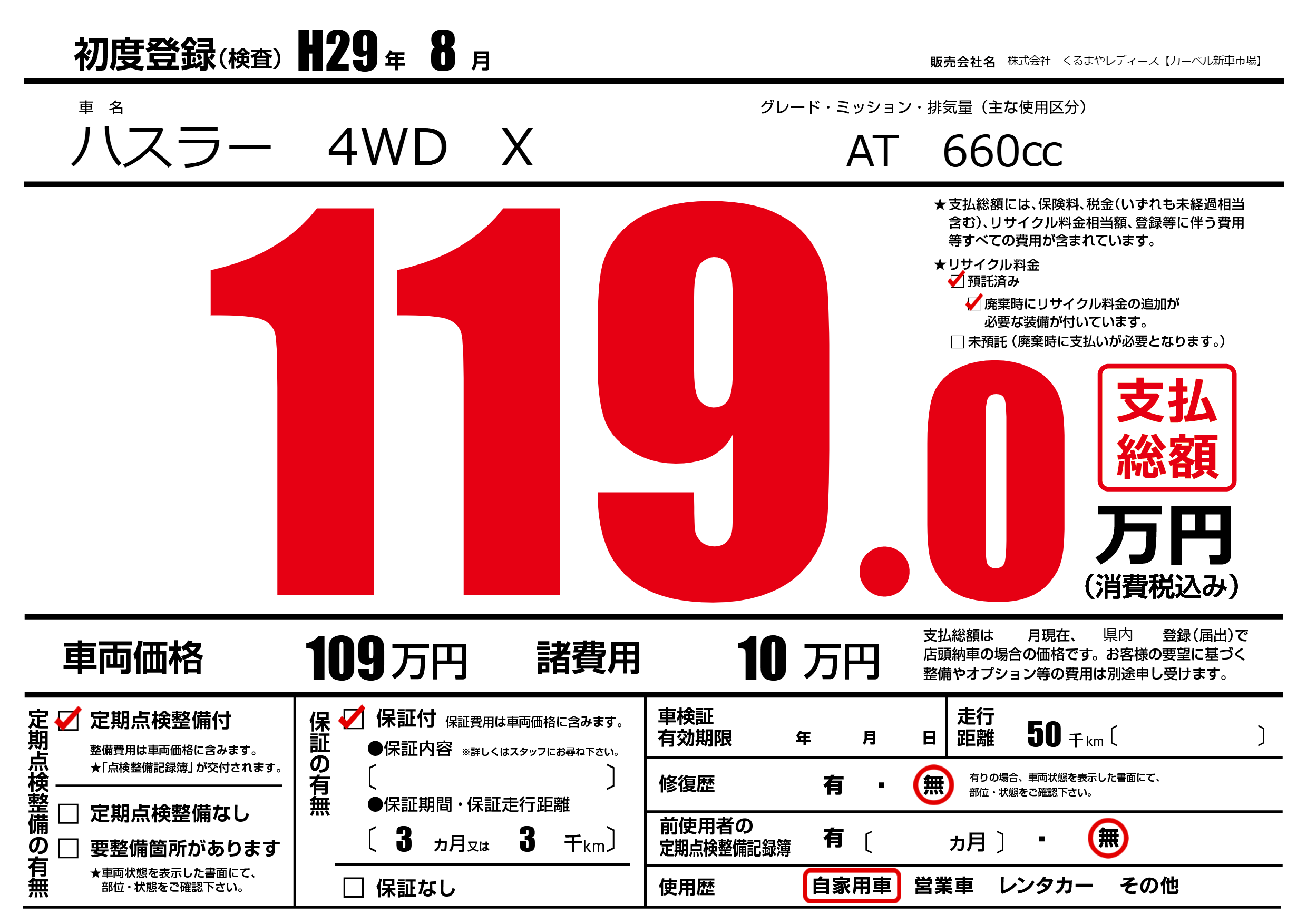 | 車名 | ハスラー 4WD X | グレード ミッション 排気量 |