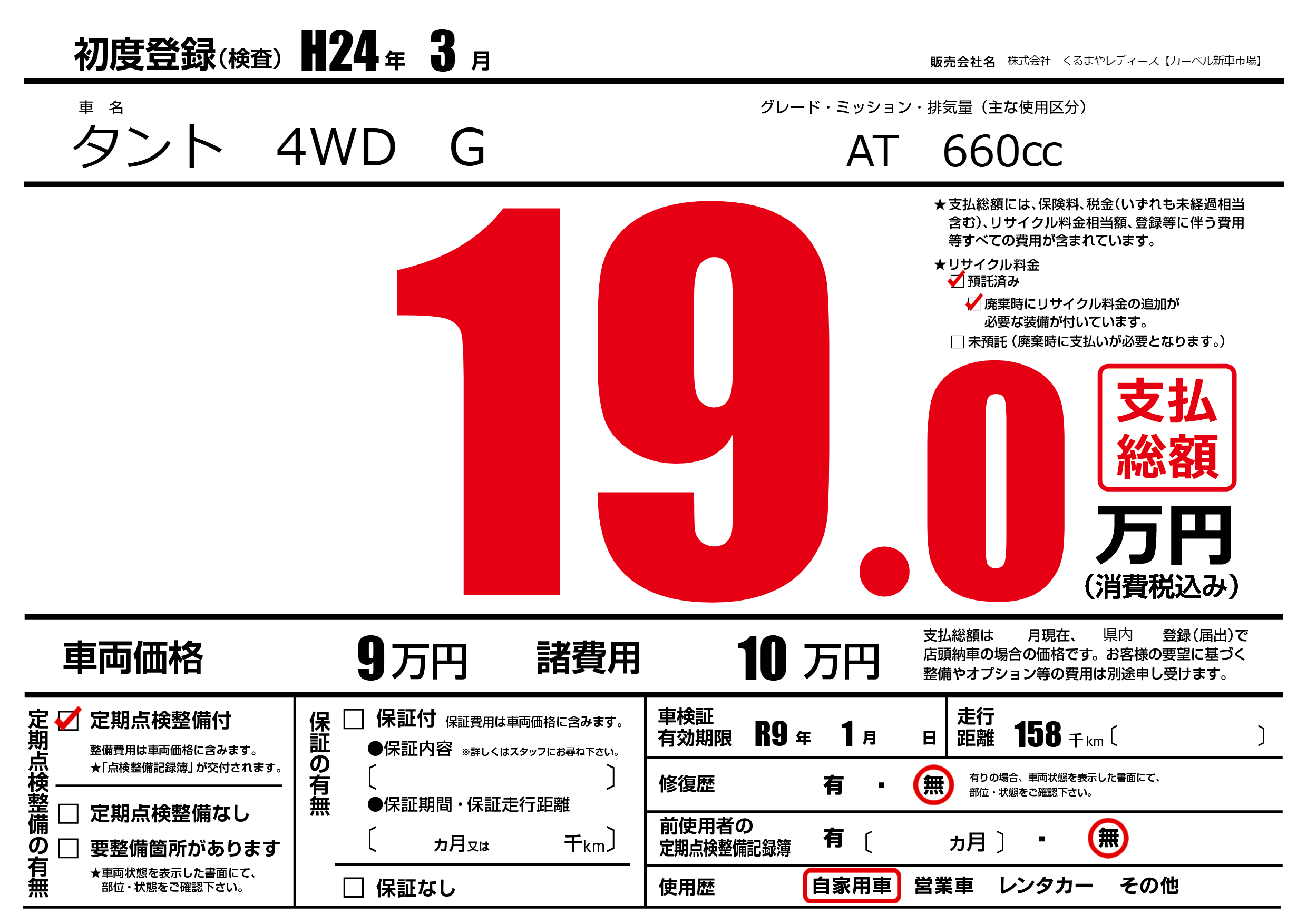 | 車名 | タント 4WD G | グレード ミッション 排気量 |