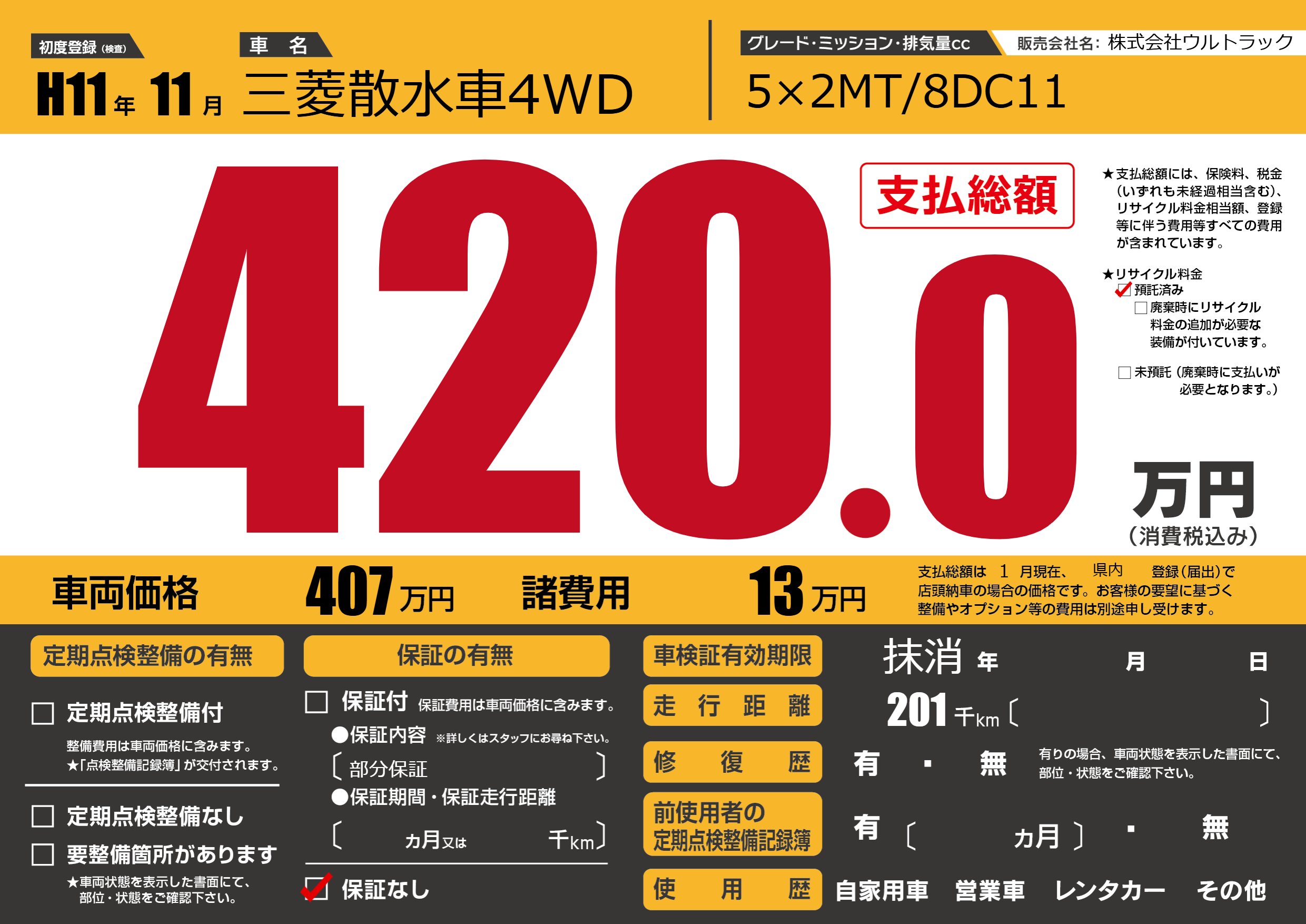 | 車名 | 三菱散水車4WD | グレード ミッション 排気量 |