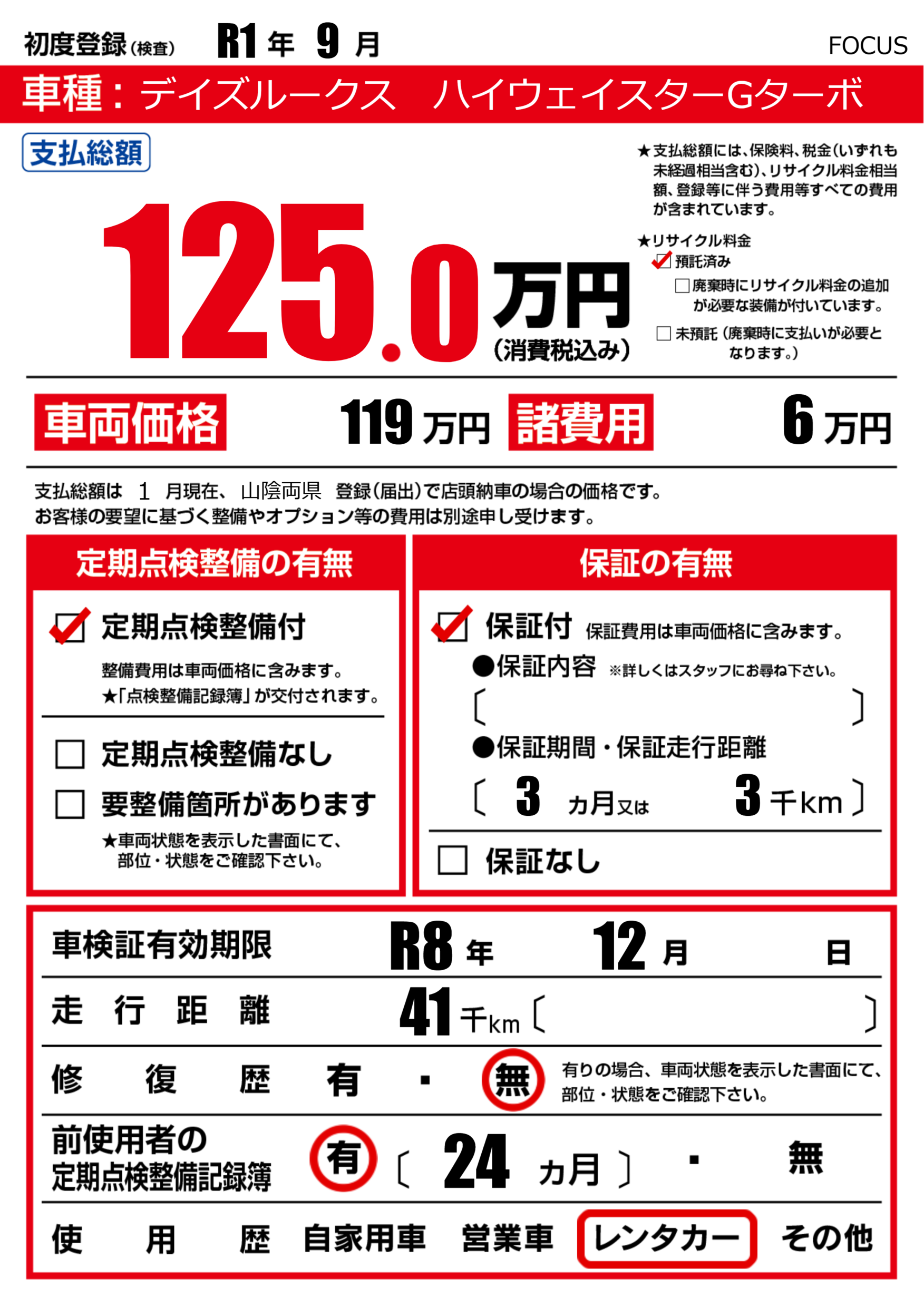 | 走行キロ | 4.1万km | 初年度登録 | R1年9月 |