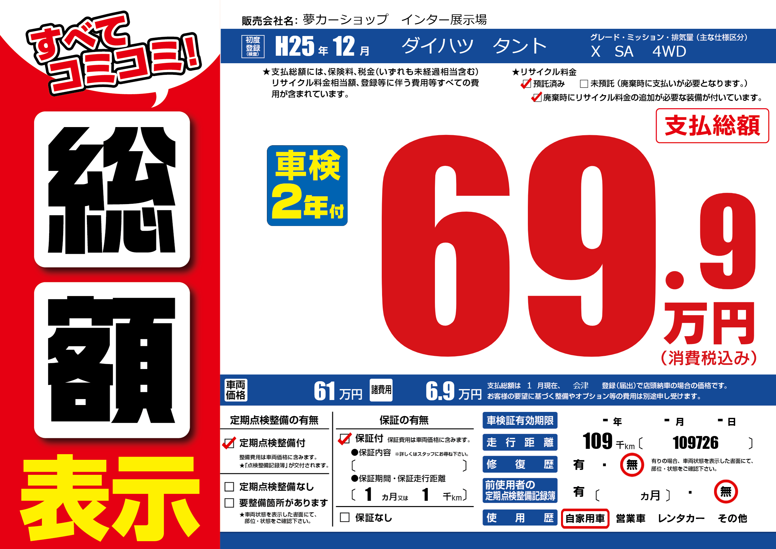 | 車名 | ダイハツ タント | グレード ミッション 排気量 |
