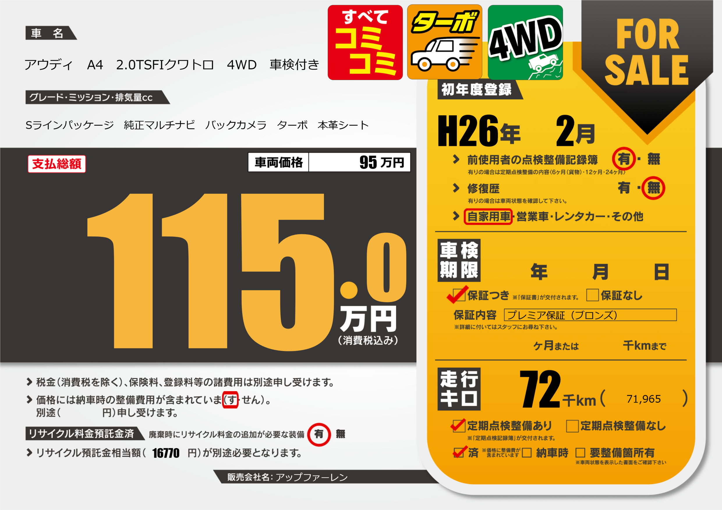 | 定期点検整備 | 定期点検整備あり 定期点検整備済み | ||
