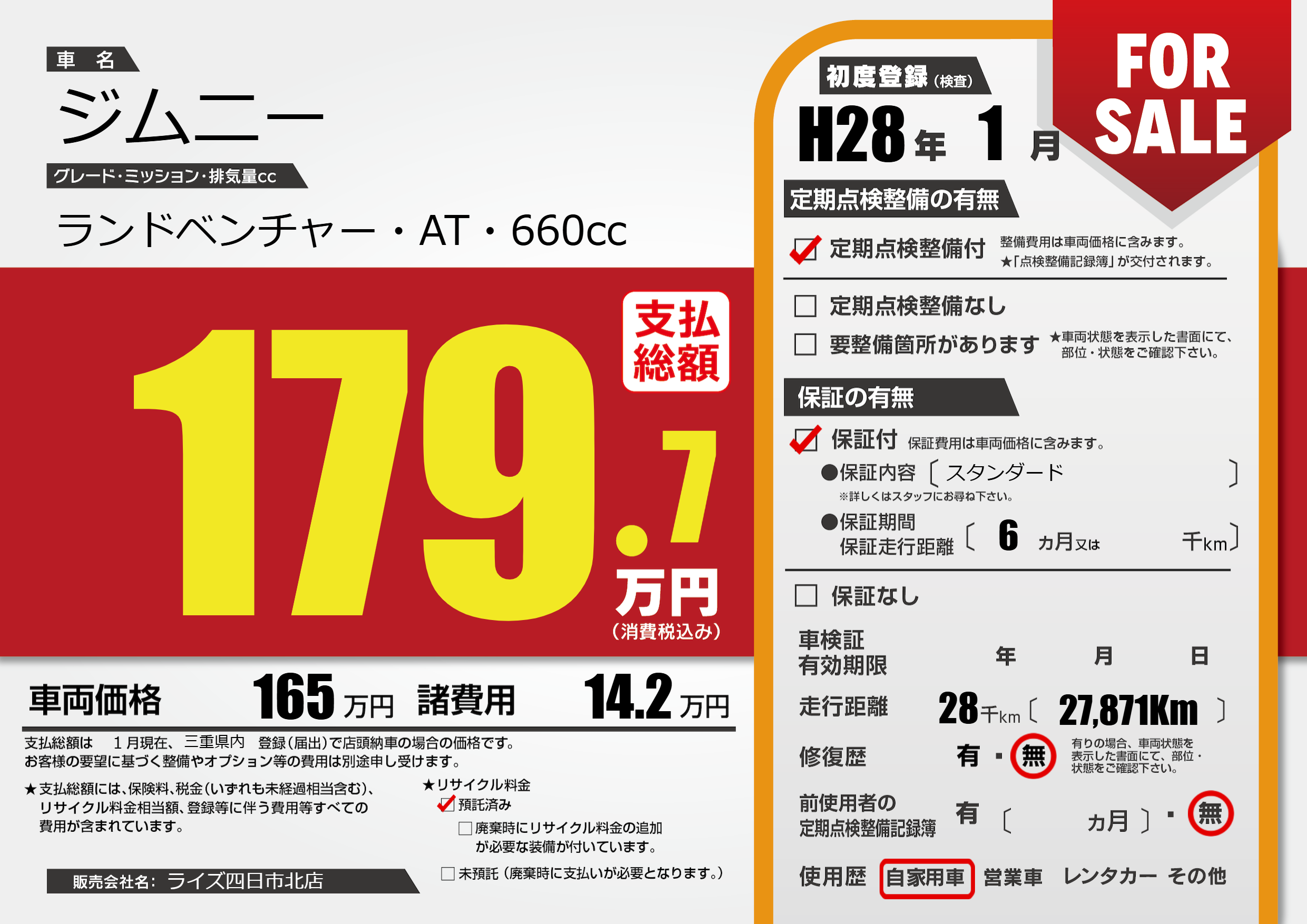 | 車名 | ジムニー | グレード ミッション 排気量 |