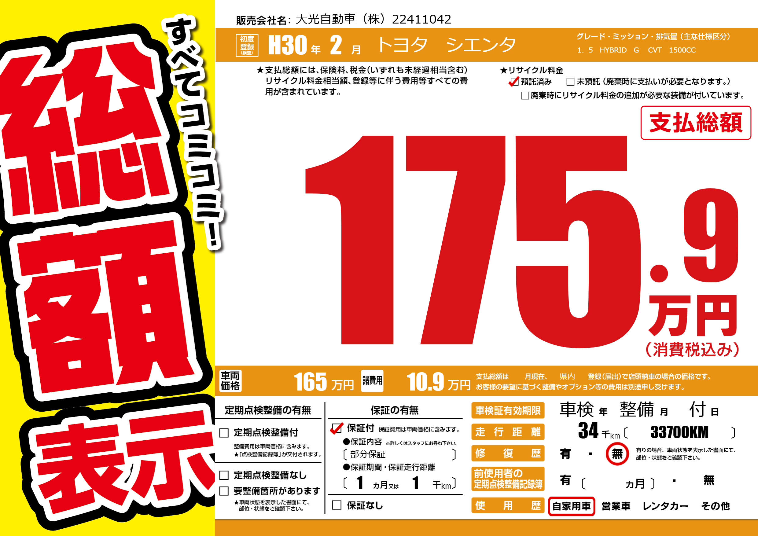 | 車名 | トヨタ シエンタ | グレード ミッション 排気量 |