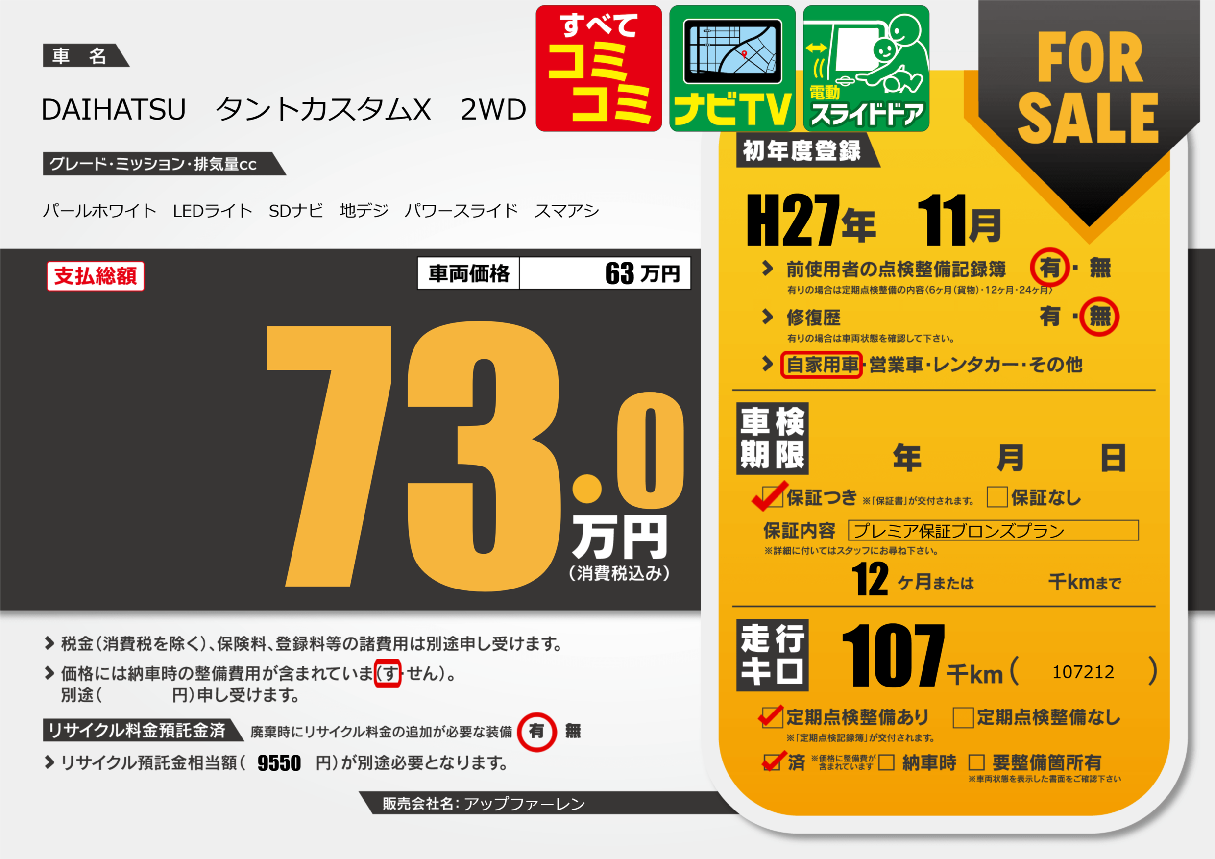 | 車名 | DAIHATSU タントカスタムX 2WD | グレード ミッション 排気量 |
