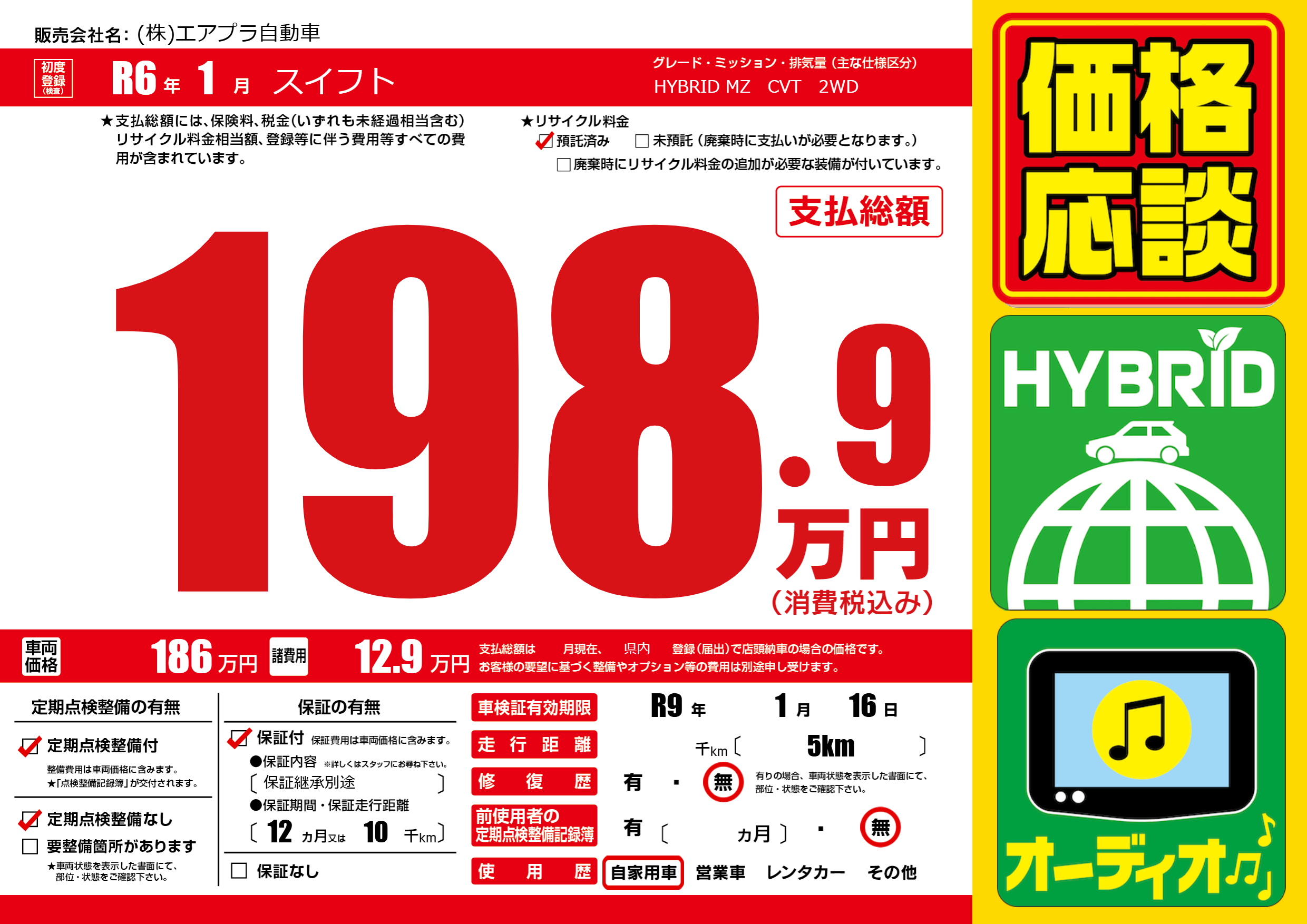 | 車名 | スイフト | グレード ミッション 排気量 |