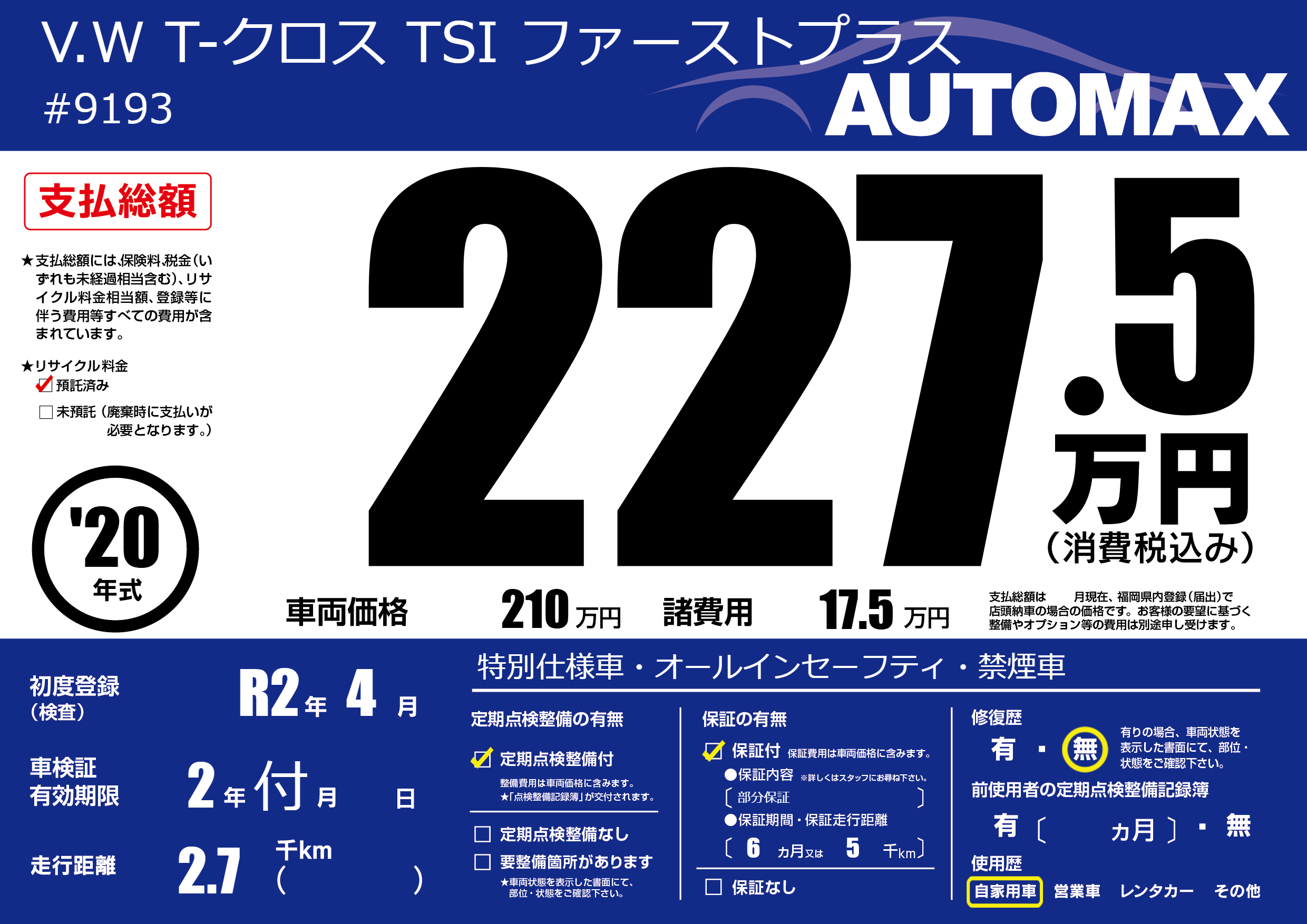 | 車名 | V.W T-クロス TSI ファーストプラス | グレード ミッション 排気量 |