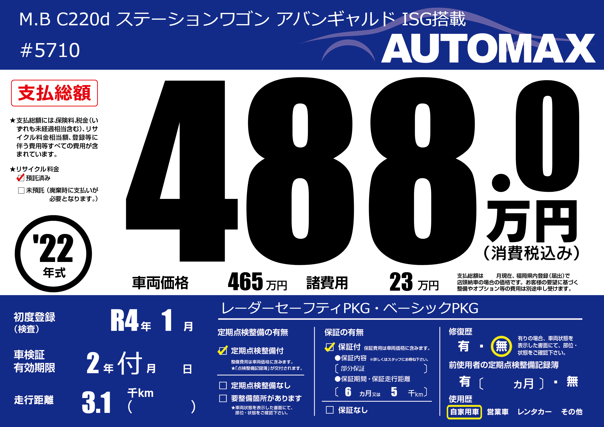 | 車名 | M.B C220d ステーションワゴン アバンギャルド ISG搭載 | グレード ミッション 排気量 |