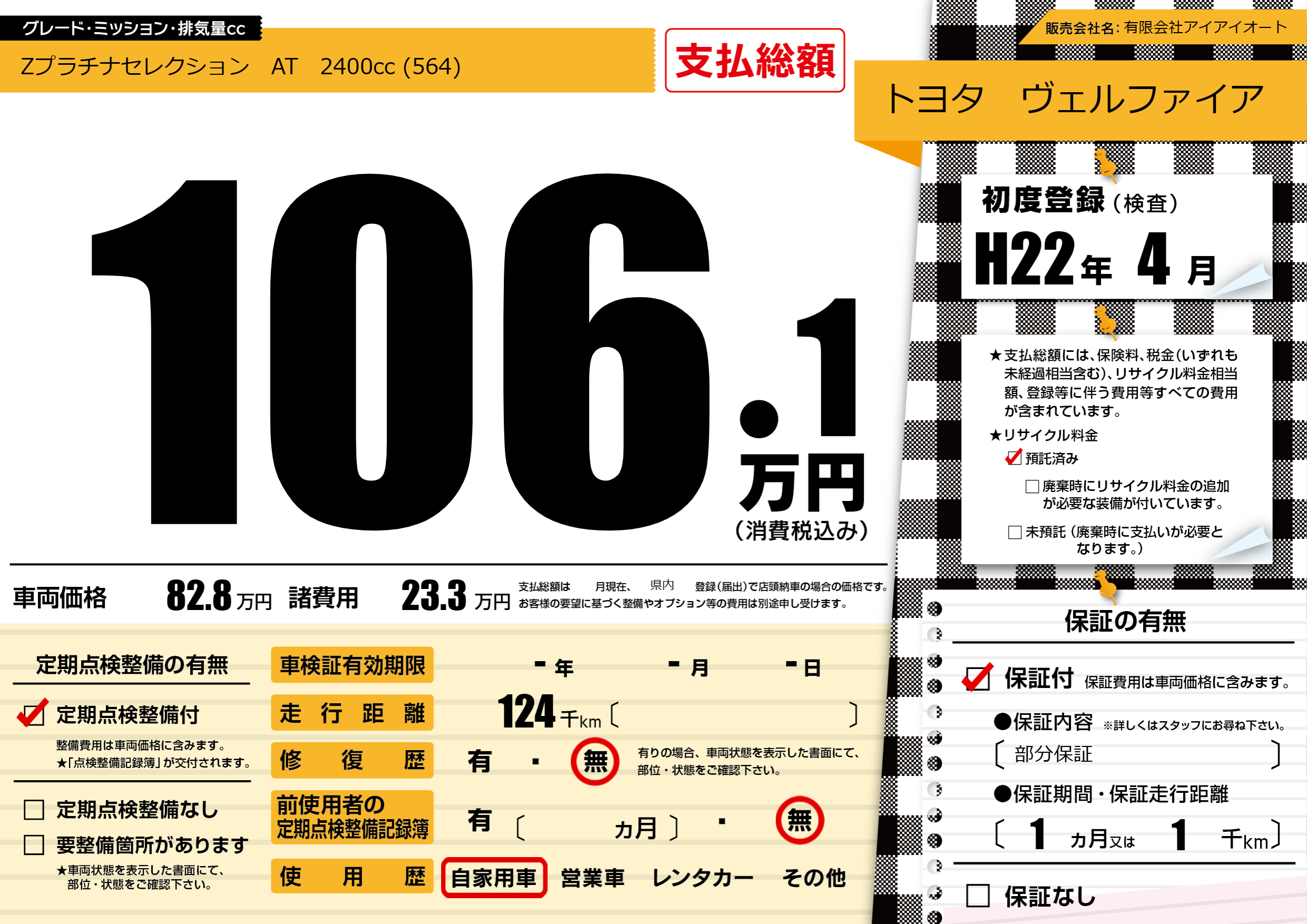 | 車名 | トヨタ ヴェルファイア | グレード ミッション 排気量 |