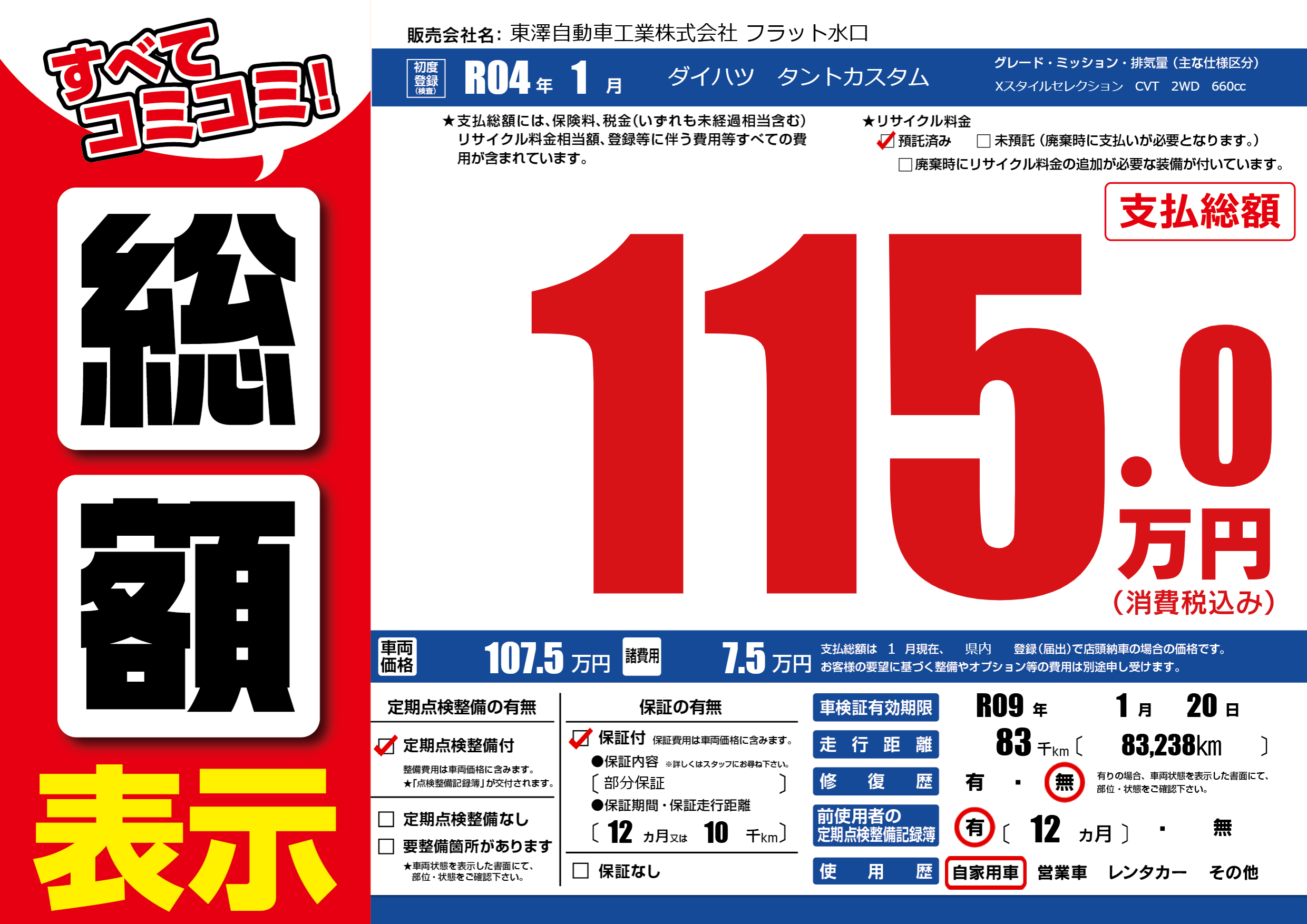 | 車名 | ダイハツ タントカスタム | グレード ミッション 排気量 |