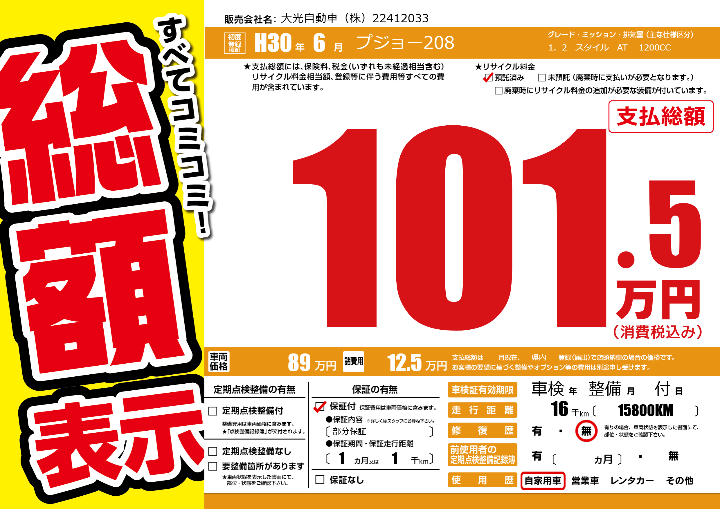| 車名 | プジョー208 | グレード ミッション 排気量 |