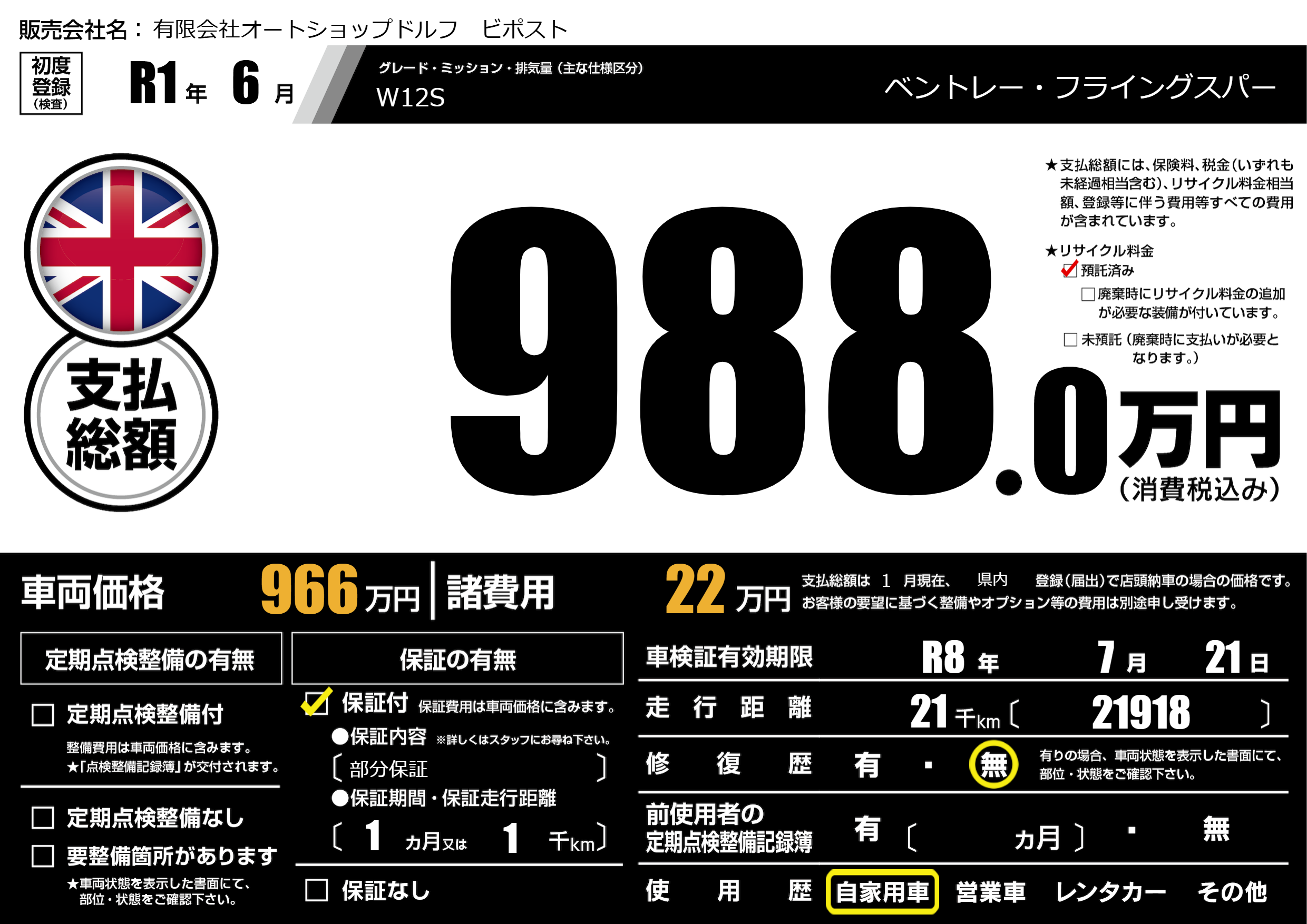| 車名 | ベントレー・フライングスパー | グレード ミッション 排気量 |