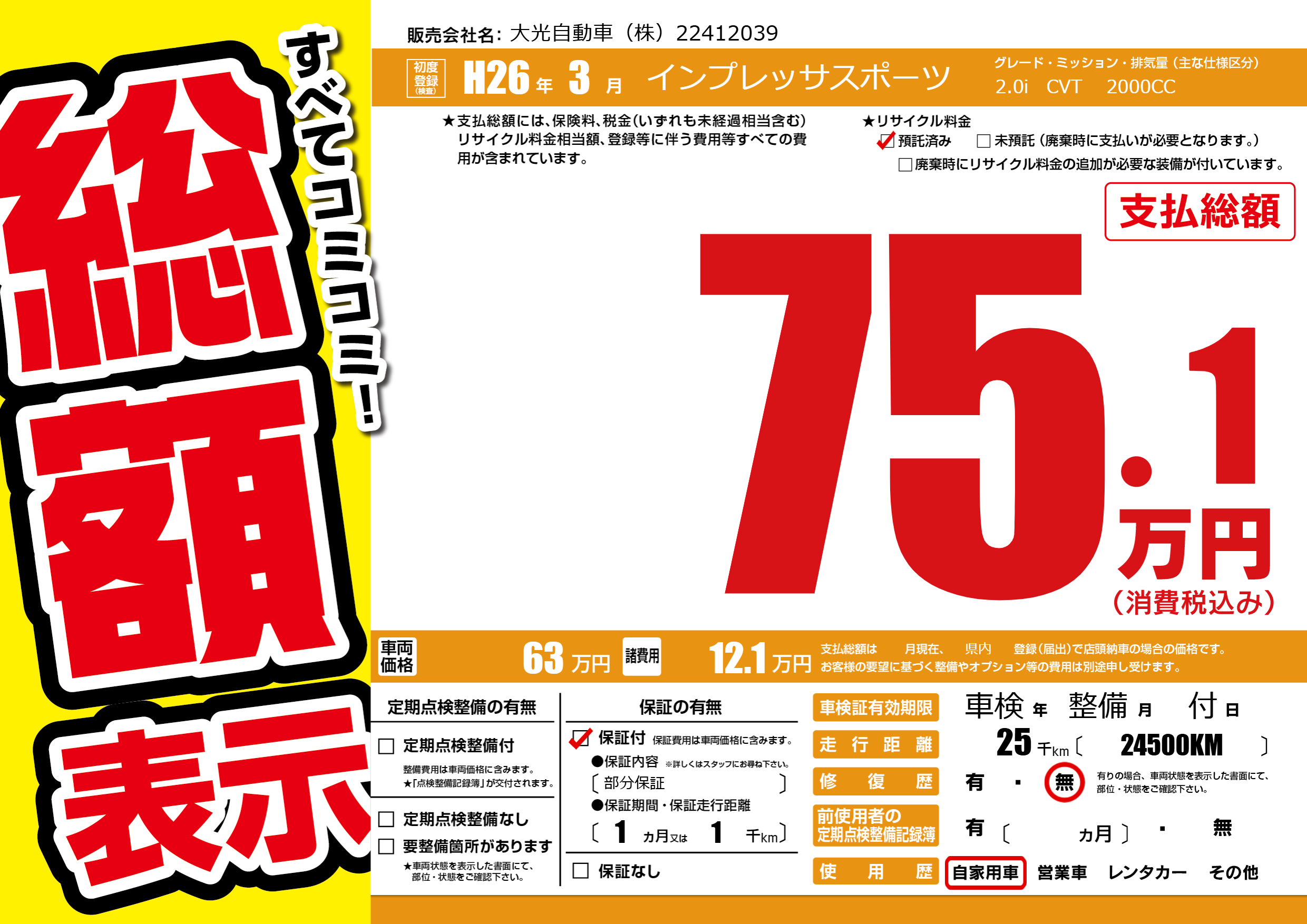| 車名 | インプレッサスポーツ | グレード ミッション 排気量 |