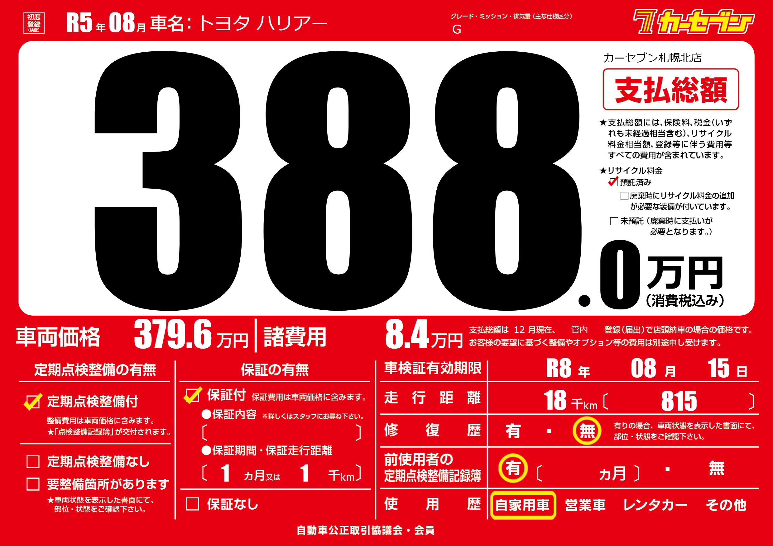 | 走行キロ | 1.8万km | 初年度登録 | R5年08月 |