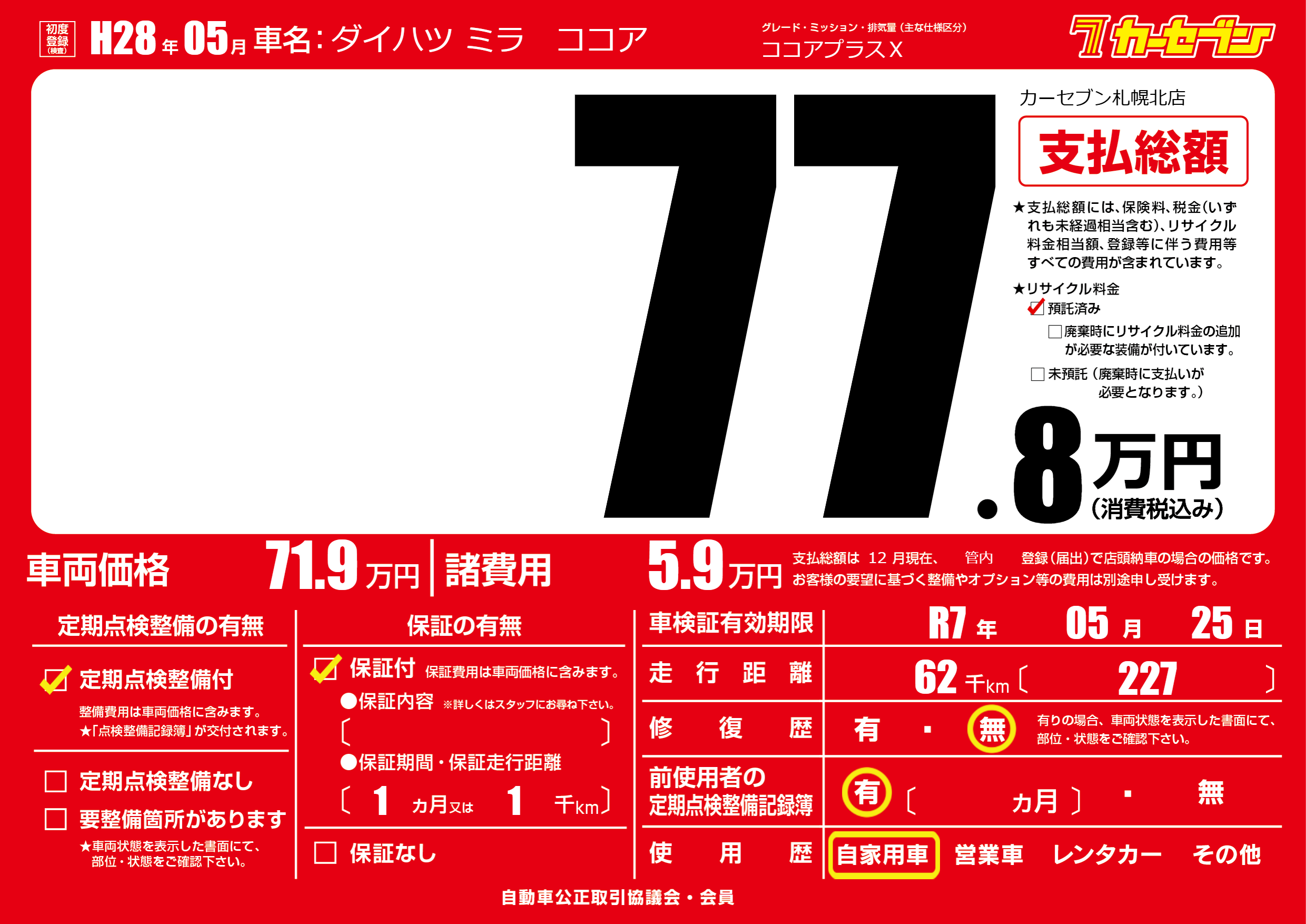 なし | 車検制限 | R7年05月25月 |