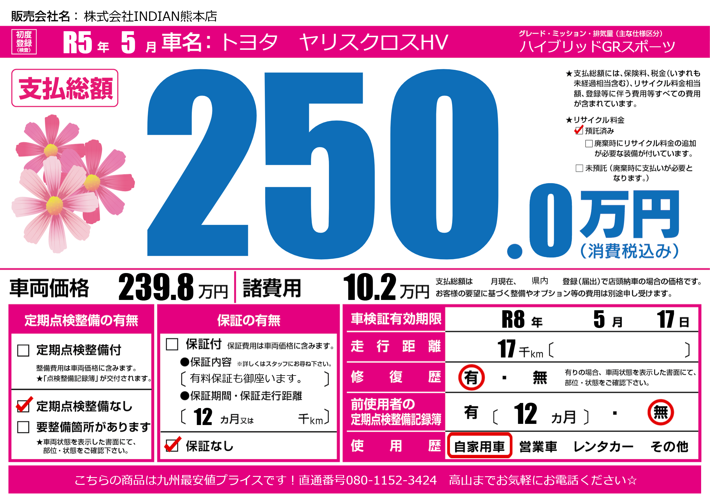 | 走行キロ | 1.7万km | 初年度登録 | R5年5月 |