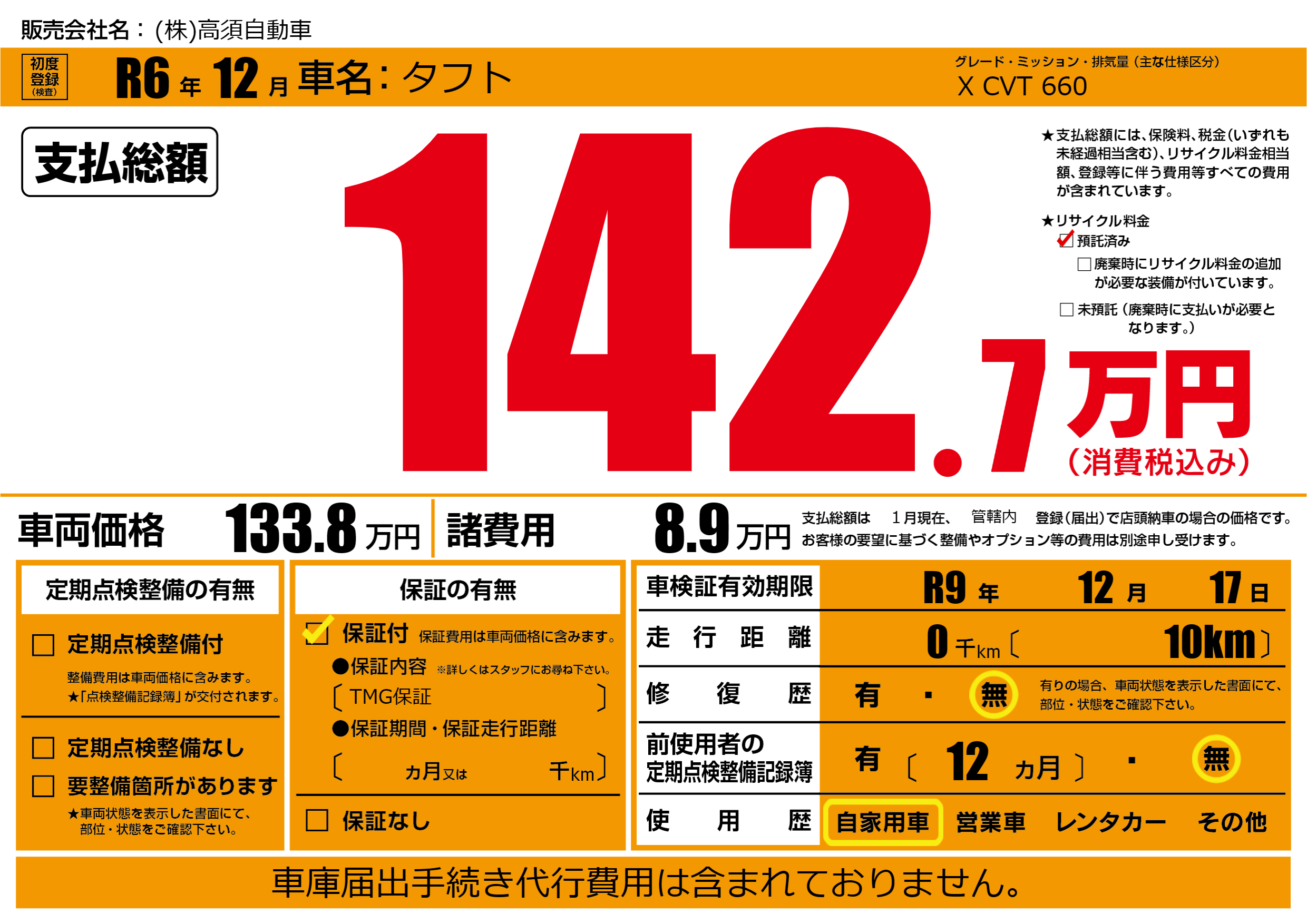 保証付き 保証内容(TMG保証) ---ヶ月または()千kmまで |