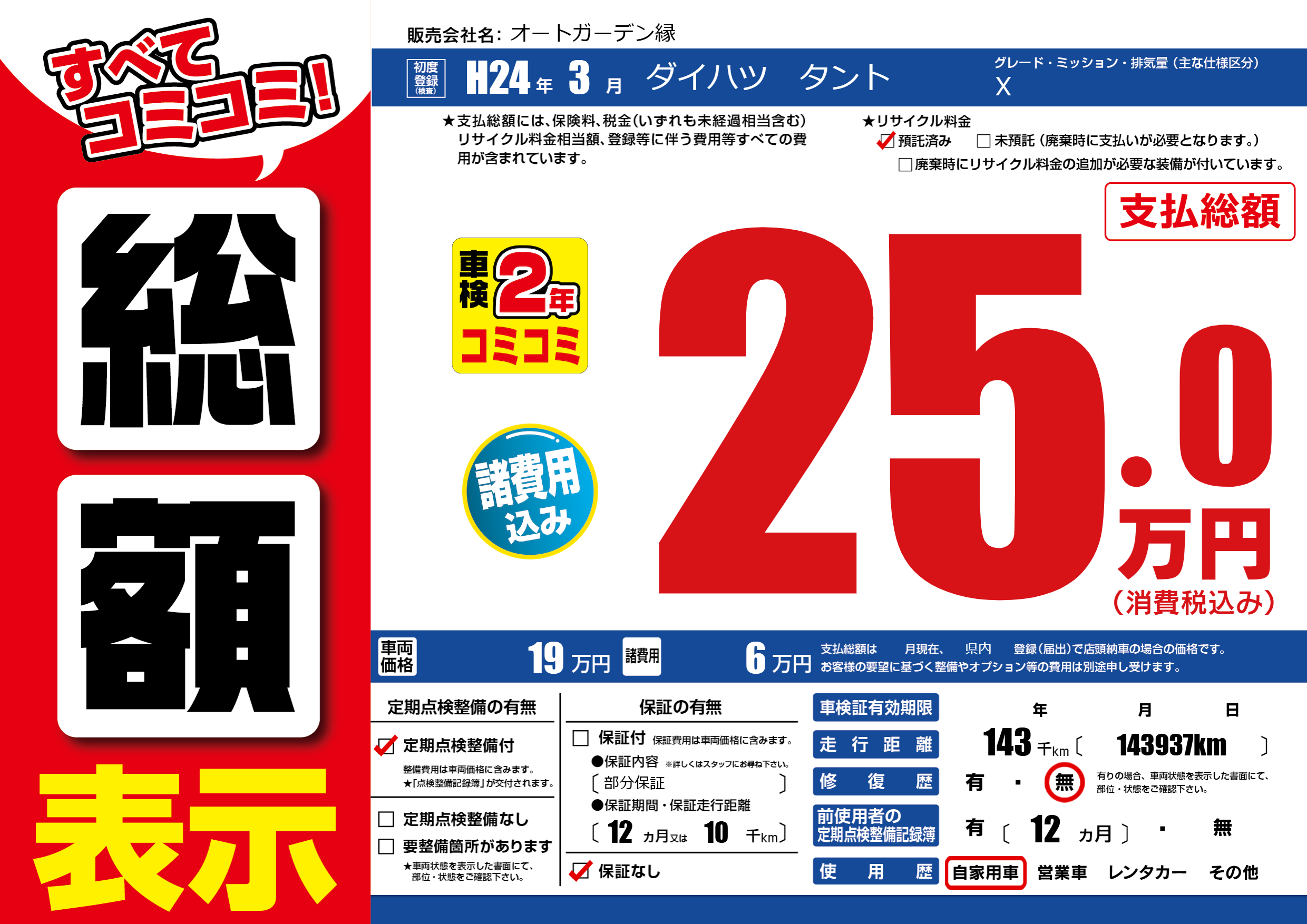 | 車名 | ダイハツ タント | グレード ミッション 排気量 |