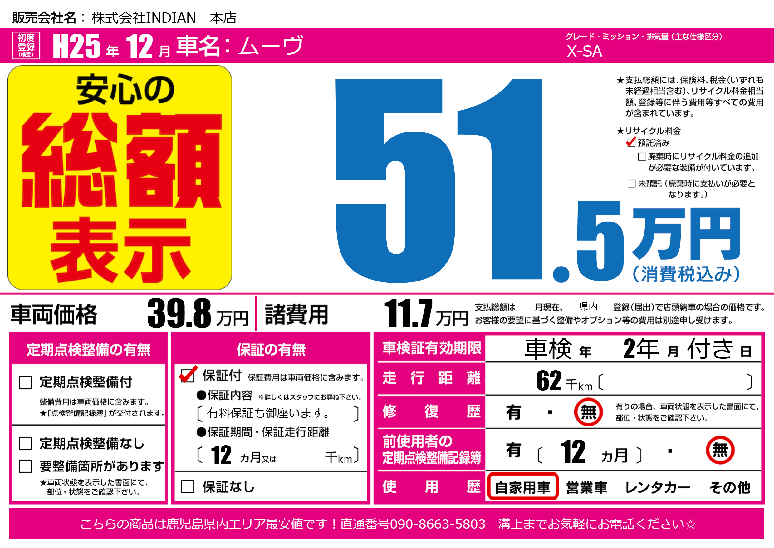 | 車名 | ムーヴ | グレード ミッション 排気量 |
