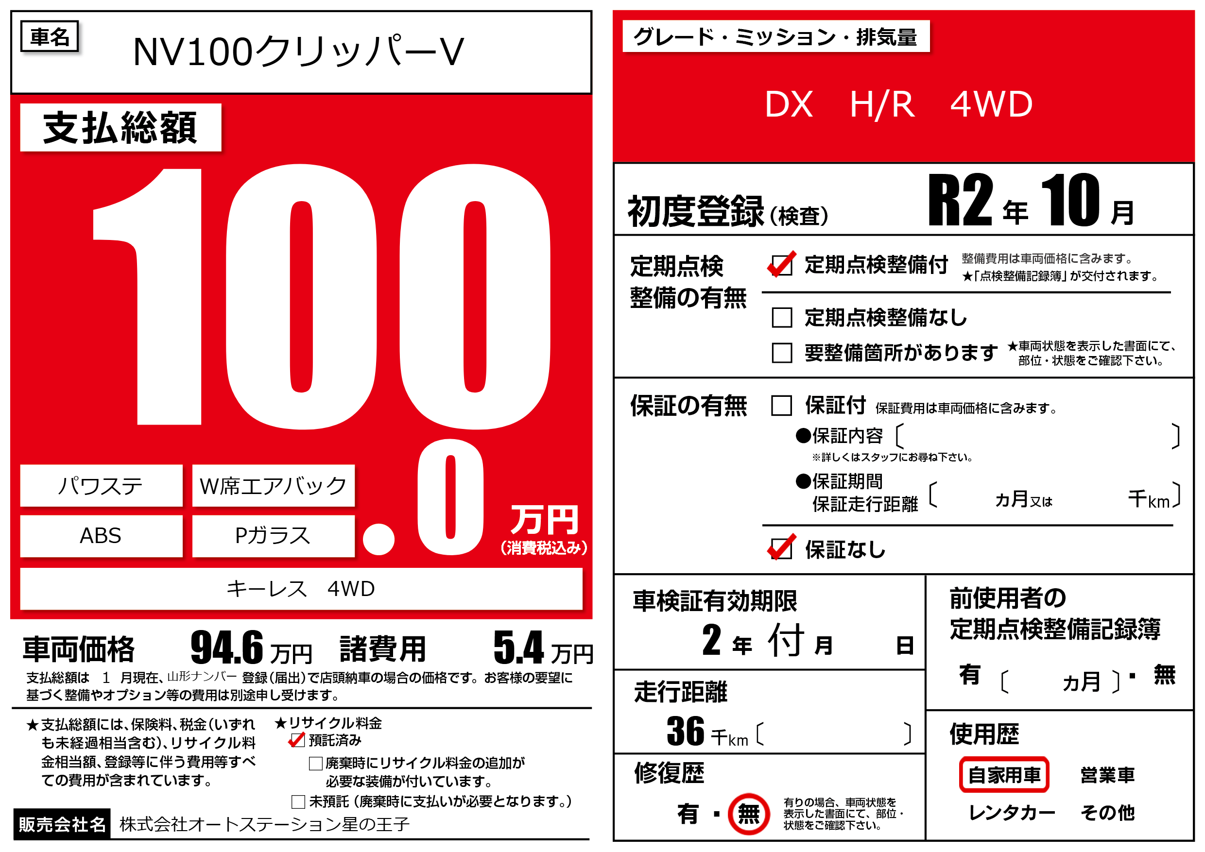 | 車名 | NV100クリッパーV | グレード ミッション 排気量 |