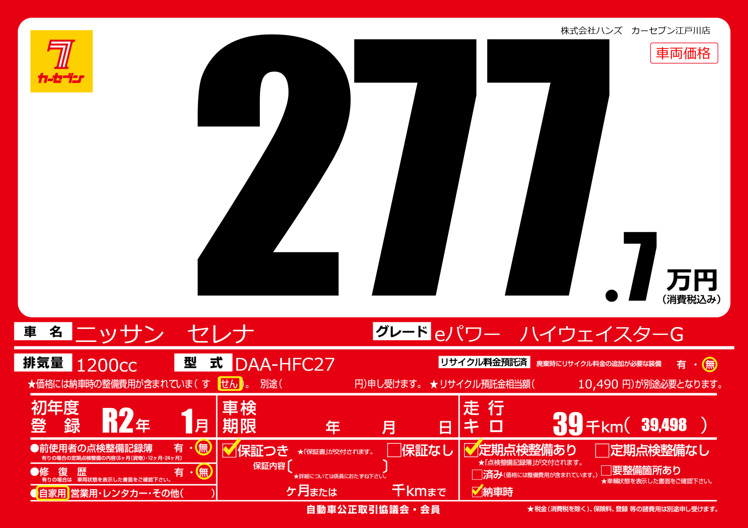 | 車名 | ニッサン セレナ | グレード ミッション 排気量 |